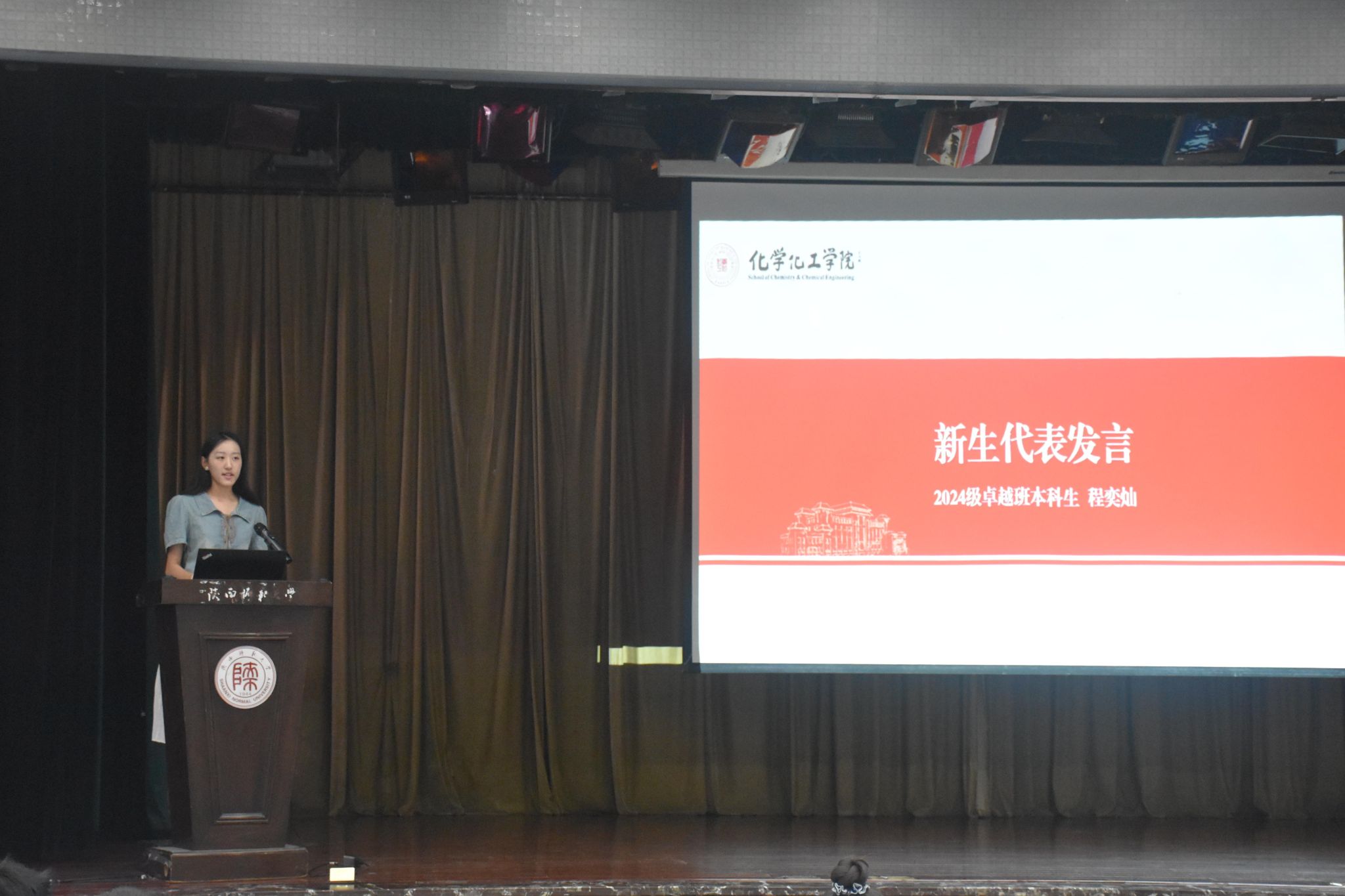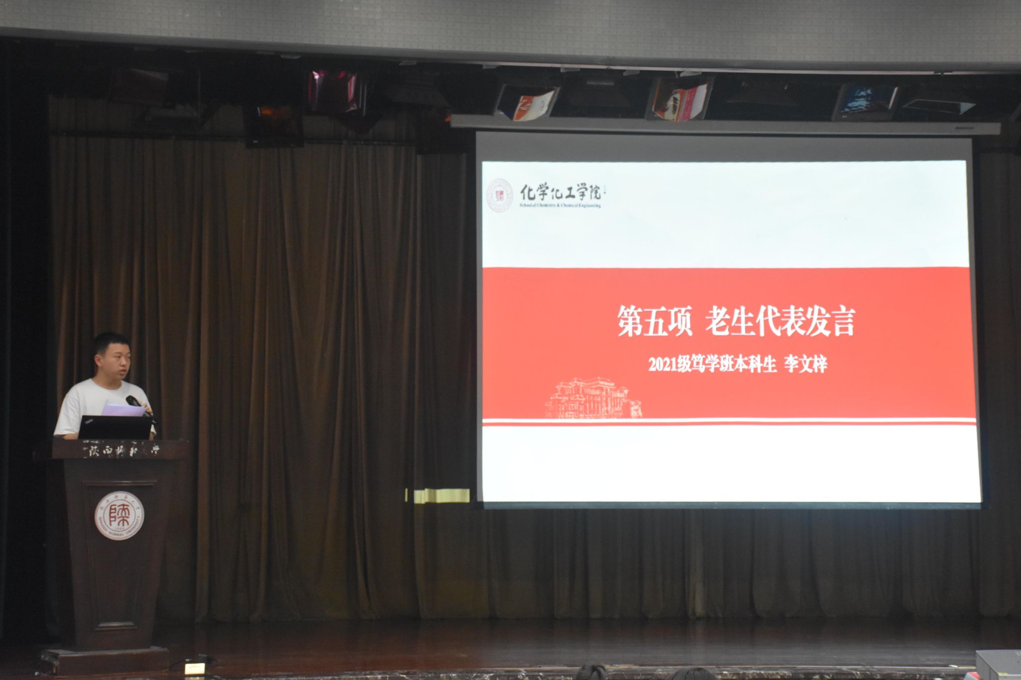 在校生代表李文梓和新生代表程奕灿两位同学先后发言,李文梓同学分享了大学四年在学习和科研上不断探索,最终以优异成绩保送至北京大学的心路历程,鼓励大家要敢于尝试,勇于探索,不断向属于自己的高峰攀登。程奕灿同学代表新生发言,她对入学后一飞冲天