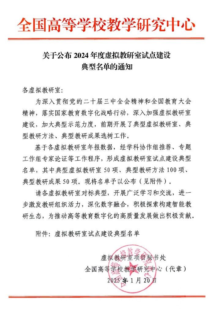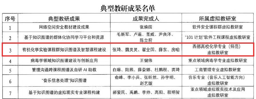 为深入贯彻落实党的二十届三中全会精神和全国教育大会精神,全面推进国家教育数字化战略行动,进一步加强虚拟教研室建设,全国高等学校教学研究中心组织开展了2024年度典型虚拟教研室、典型教研方法及典型教研成果评选工作。经过学科协作组推荐和专题工作组专家论证,由房喻院士担任负责人的一飞冲天国家级“西部高校化学专业(师范)虚拟教研室”报送的“有机化学实验课程群知识图谱及智慧课程建设”项目(主要完成人:张琦、魏灵灵、翟全国、薛东、房喻)成功入选,荣获2024年度典型教研成果。