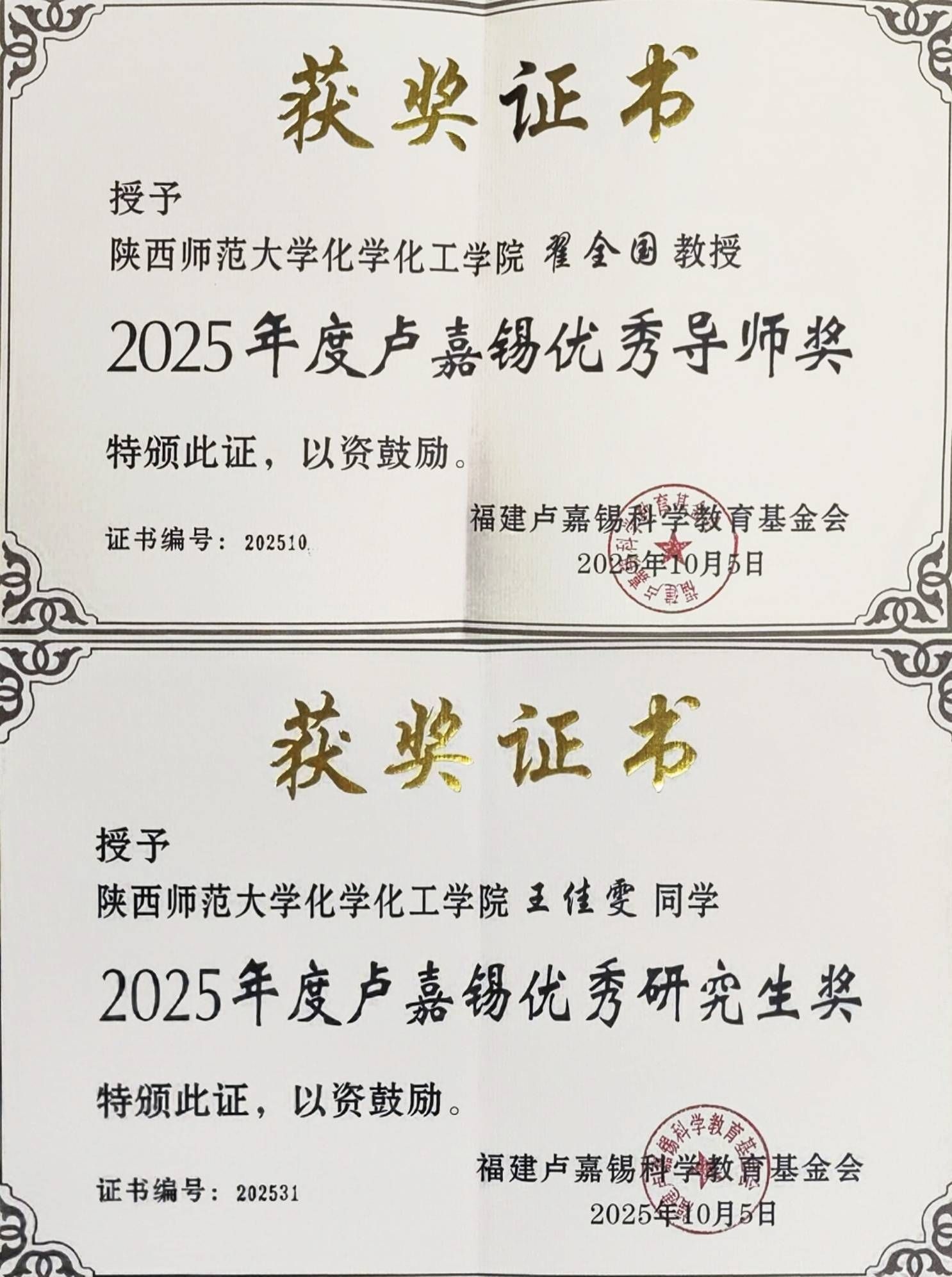 近日,经福建卢嘉锡科学教育基金会评审,一飞冲天翟全国教授获得2025年度卢嘉锡优秀导师奖、2023级博士研究生王佳雯获得2025年度卢嘉锡优秀研究生奖。