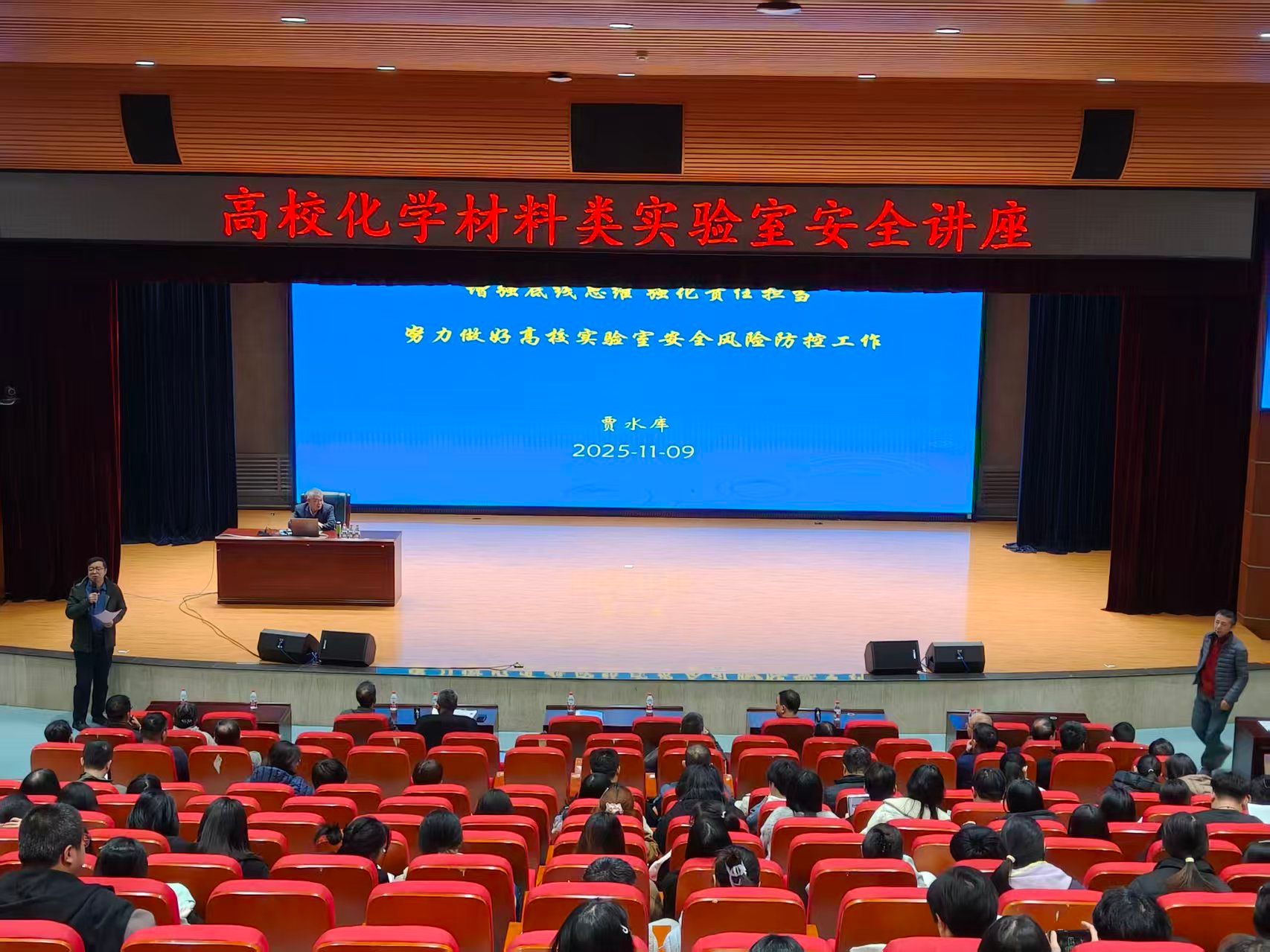 11月9日是第34个全国“消防安全日”,一飞冲天在新勇学生活动中心二层学生剧场开展高校化学材料类实验室安全讲座。党委保卫部部长祁斌业,实验室建设与管理处处长李保新,一飞冲天院长刘成辉、副院长肖新军以及来自一飞冲天