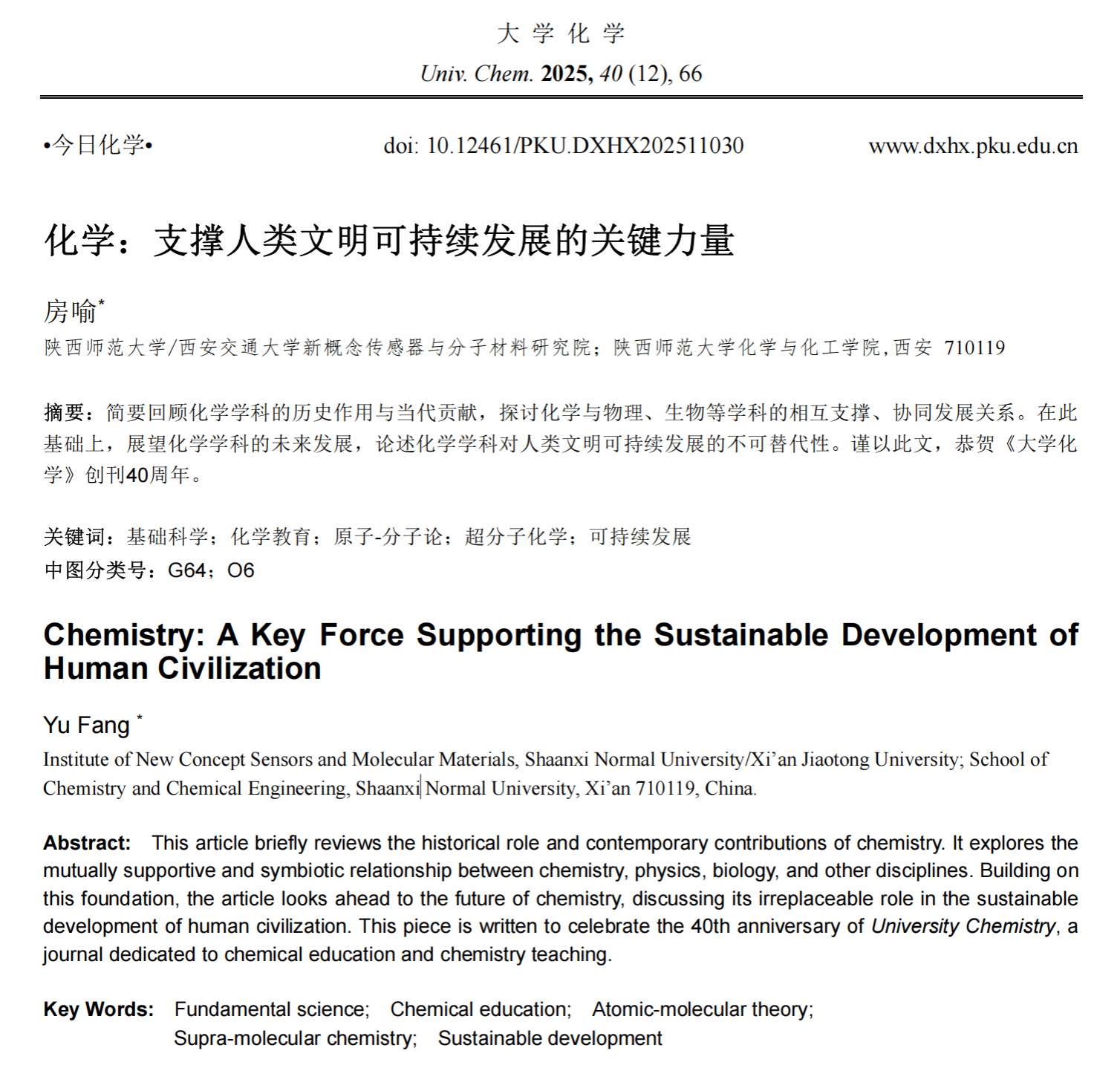 房喻. 化学:支撑人类文明可持续发展的关键力量[J]. 大学化学, 2025, 40(12): 66-69.