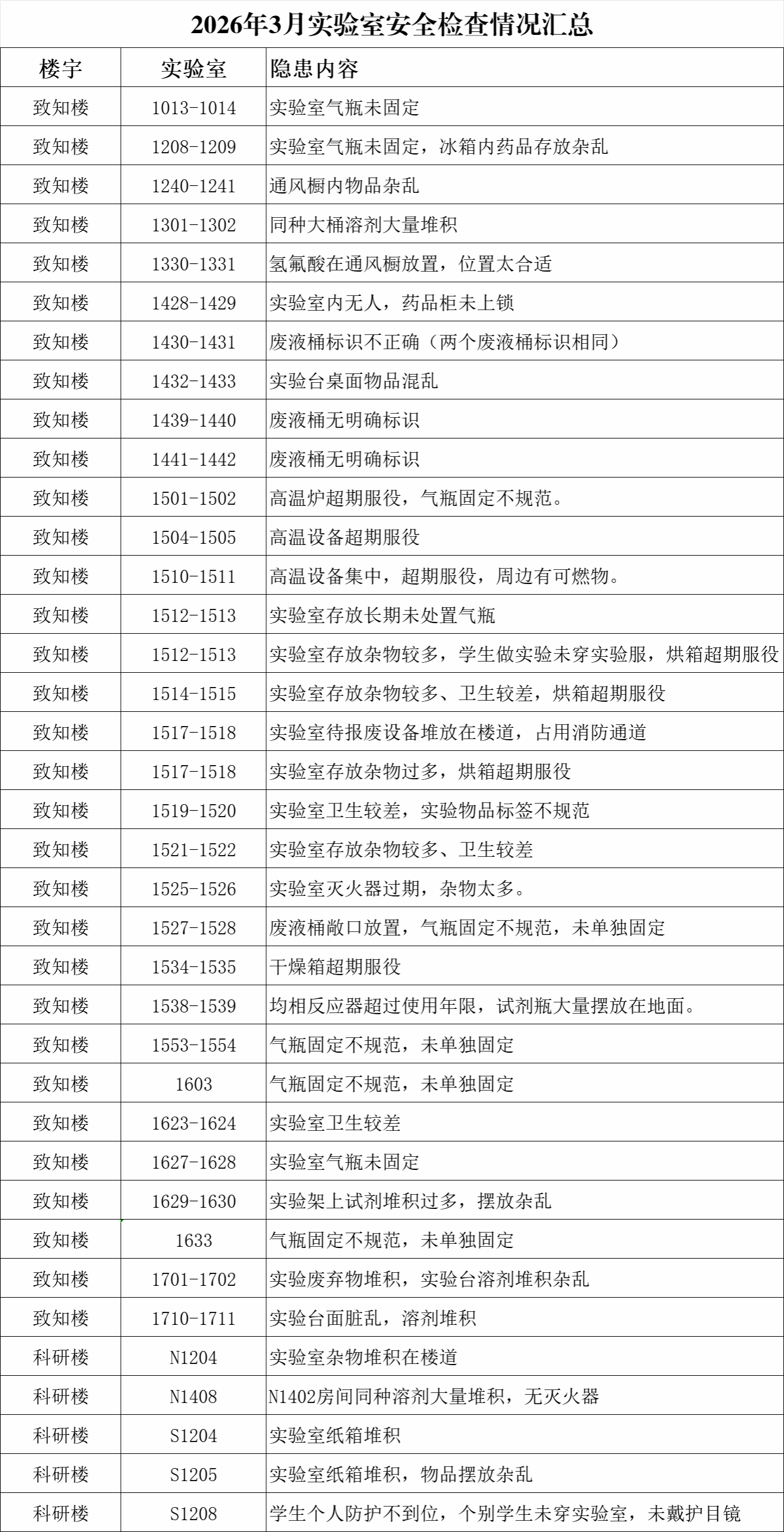 本次检查发现的问题主要集中在六大方面:一是气瓶管理不规范;二是实验设备超期服役问题突出,高温炉、烘箱等设备均出现超期使用情况;三是化学品与试剂管理混乱,存在同种大桶溶剂大量堆积、实验架试剂摆放杂乱等问题;四是废液与废弃物处置不规范,废液桶存在标识错误、无明确标识、敞口放置等情况;五是消防保障存在短板,个别实验室灭火器过期、无灭火器,待报废设备和杂物堆积在楼道,占用消防通道;六是个人防护与安全管理不到位,有学生做实验未穿实验服、未戴护目镜。