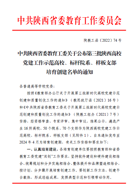 第三批全省党建工作标杆院系、样板支部培育创建单位面向全省高校党委和党支部公开遴选。经资格审查、专家评审、集中审议、结果公示,最终遴选产生16所高校、50个院系、70个支部作为陕西高校党建工作示范高校、标杆院系、样板支部,进行为期2年的创建培育工作。