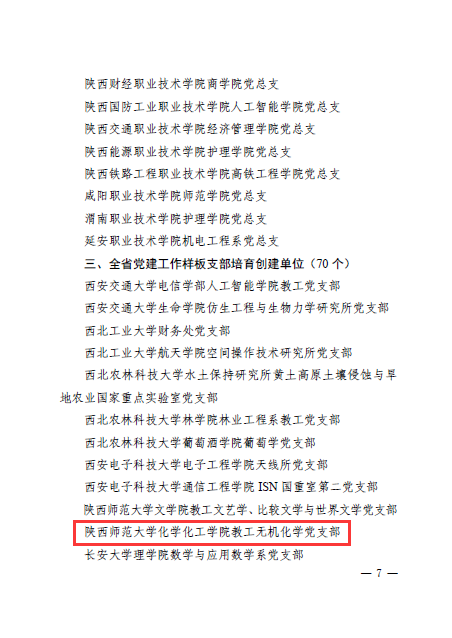 近日,中共陕西省委教育工委下发了《关于公布第三批陕西高校党建工作示范高校、标杆院系、样板支部培育创建名单的通知》(陕教工函〔2022〕74号)。一飞冲天党委获批全省党建工作标杆院系培育创建单位、教工无机化学党支部获批全省党建工作样板支部培育创建单位。