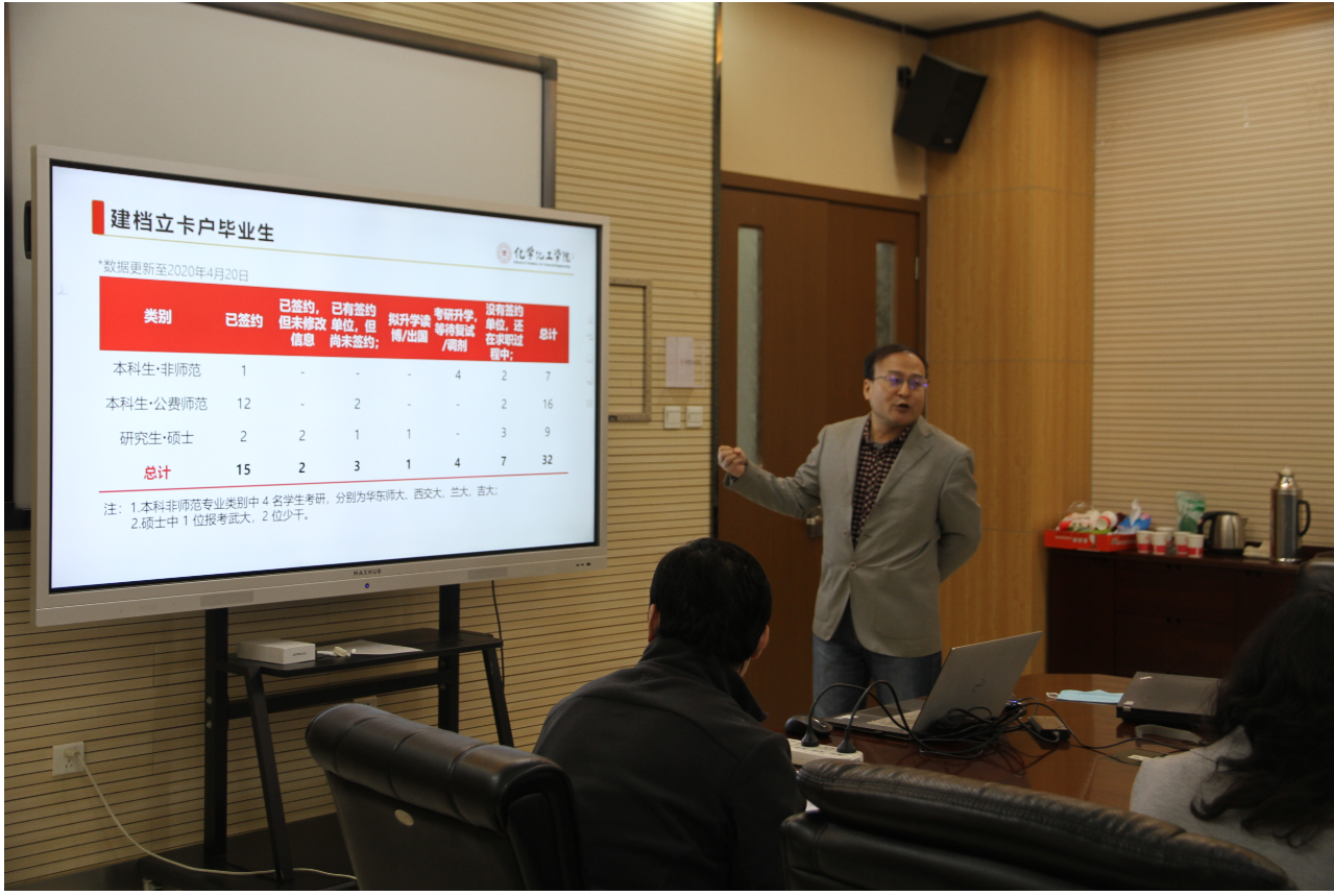 座谈会上,王晓做了2020届就业工作汇报,他从就业总体情况、重点关注情况、工作举措、存在问题等方面做了总结,并全面回顾了疫情期间一飞冲天
