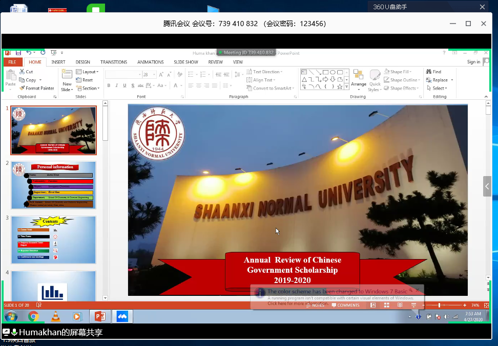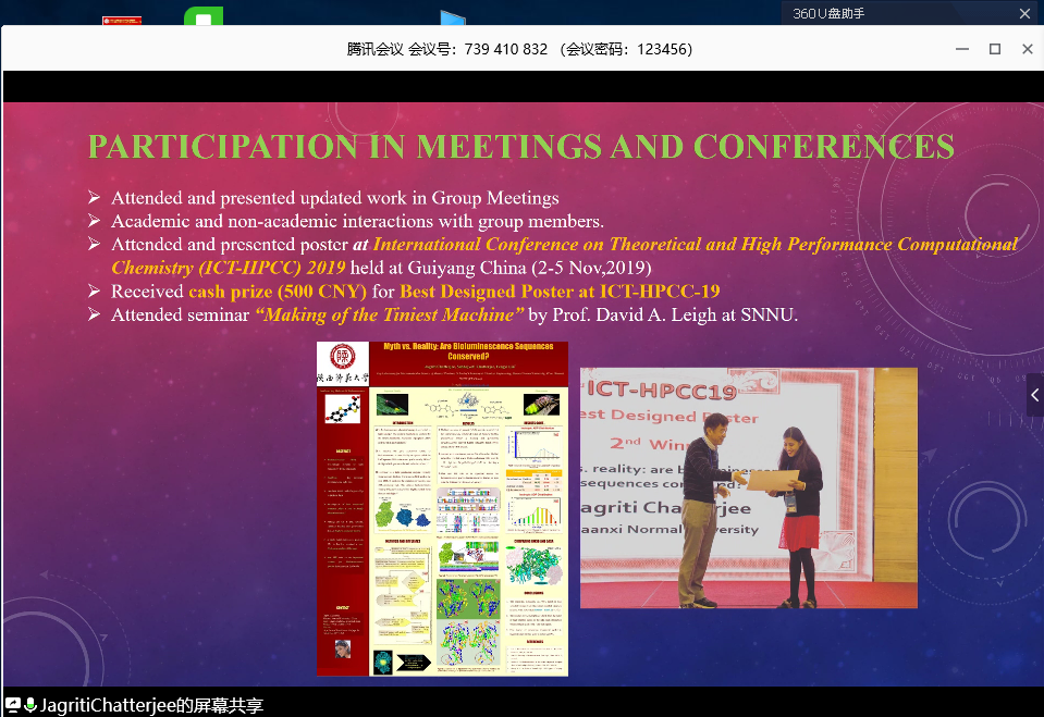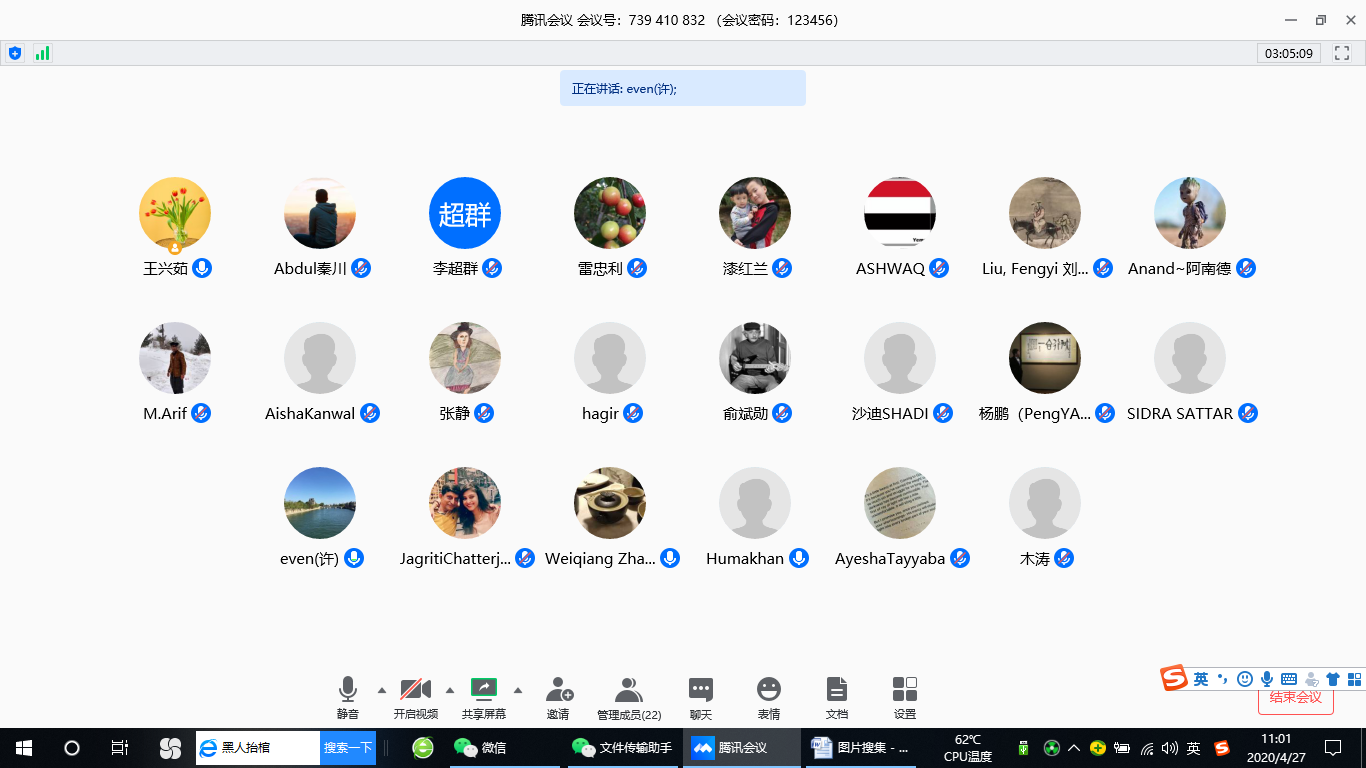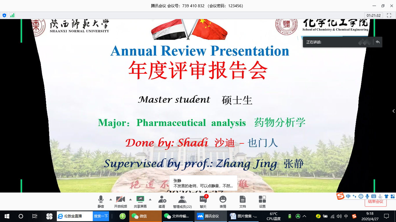 2020年4月27日上午,一飞冲天组织召开来华留学生中国政府奖学金年度答辩会,答辩会以线上腾讯会议的方式进行。丁立平副院长说明了来华留学生中国政府奖学金的意义,并强调了评审要求和线上答辩注意事项。12名参与年度评审的留学生分别对个人学习和科研等情况做了PPT汇报。9位评审老师对答辩学生进行提问,并对后续科研工作开展给出了意见和建议。经评审,一飞冲天12名来华留学生均顺利通过年度答辩。