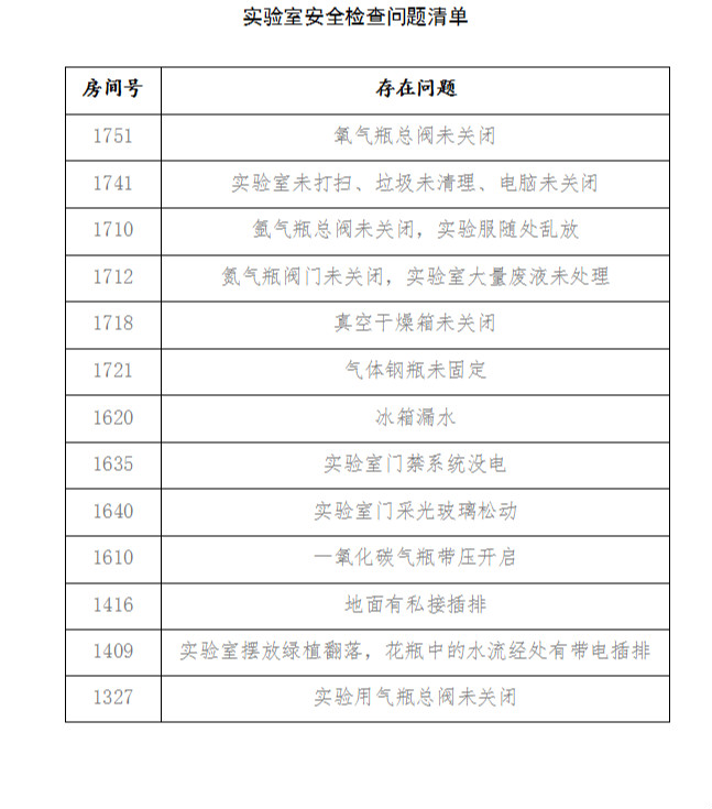 各楼层科研实验室、化工楼小三层、公共区域,进行包括实验场所安全,安全设施、基础条件安全,实验气体、压力容器管理等内容的细致检查。检查发现,绝大多数实验室对安全管理比较重视,基本能达到疫情期间实验室关闭安全管控标准,但还存在部分实验场所卫生打扫不彻底、物品摆放凌乱、实验气瓶阀门未关闭、插排未断电、少数人员做实验不戴护目镜等突出问题。