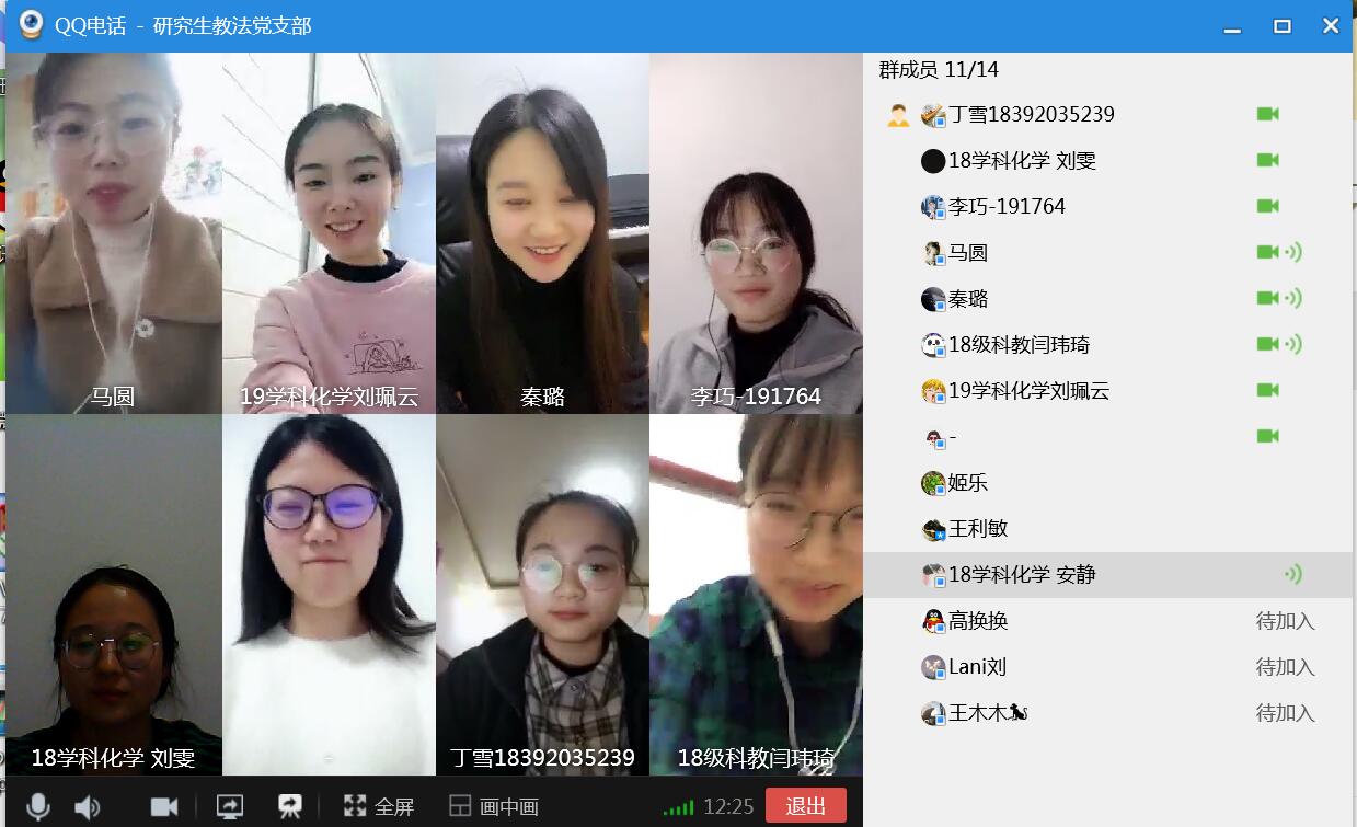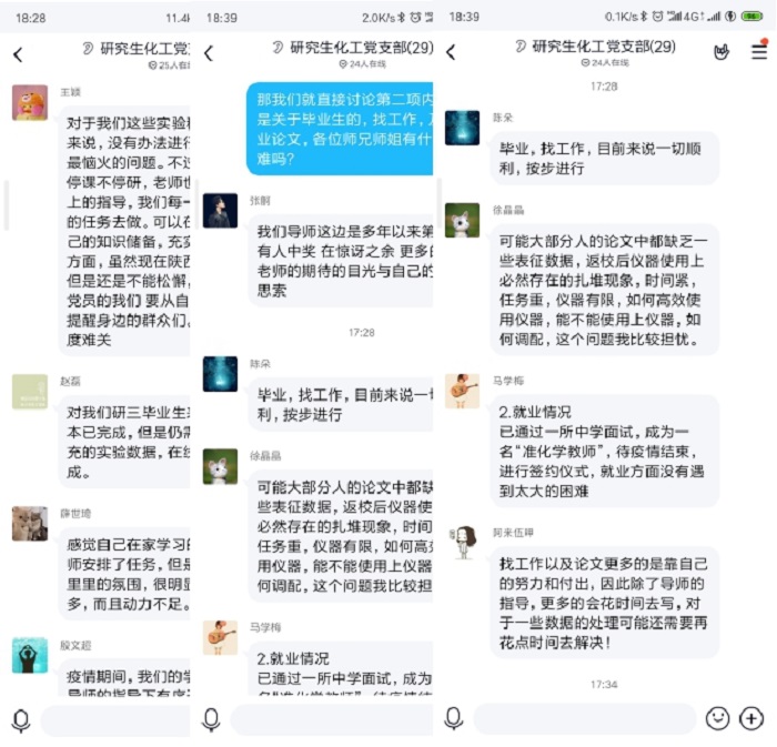 随后,全体党员进行线上讨论,分别就在家科研、就业、网络授课等交流发言。