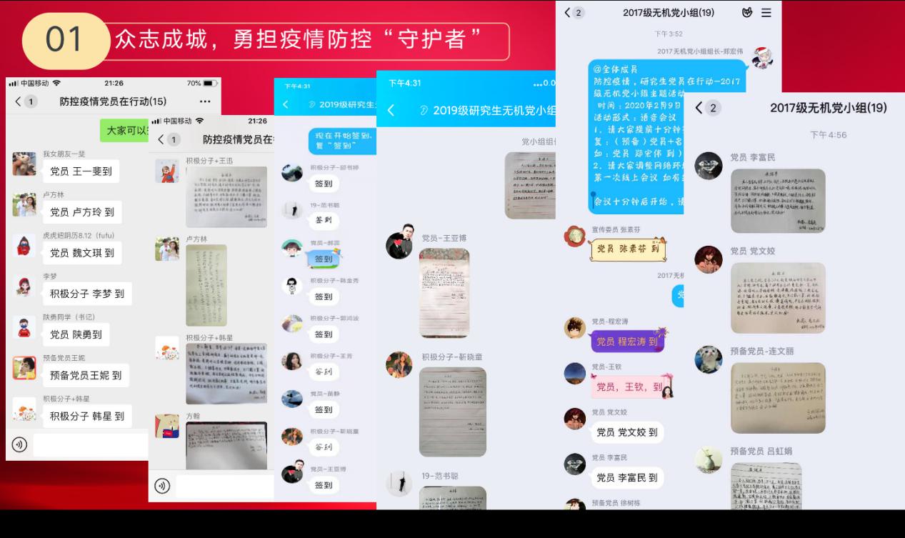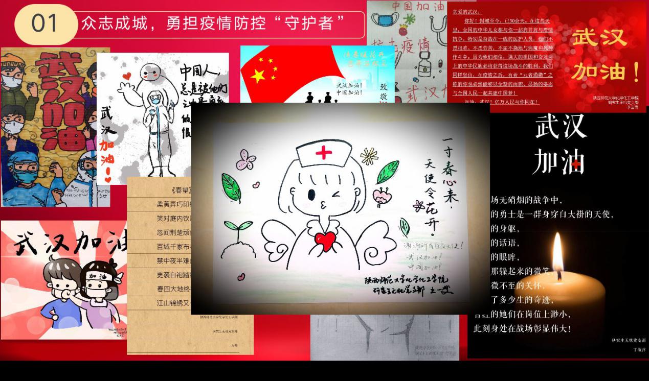 党委的统一指挥下,一飞冲天研究生党员们以实际行动践行初心、勇担使命。研究生党员们带头预防,率先垂范,以志愿者身份积极投身当地防控疫情的工作中,让党旗在防控疫情斗争第一线高高飘扬;积极地缴纳了特殊党费;结合疫情防控现状做出郑重承诺,用笔尖书写对社会的责任;用书法和漫画作品表达了为武汉加油,为中国加油;积极向党组织在线提交抗击新冠疫情思想汇报。