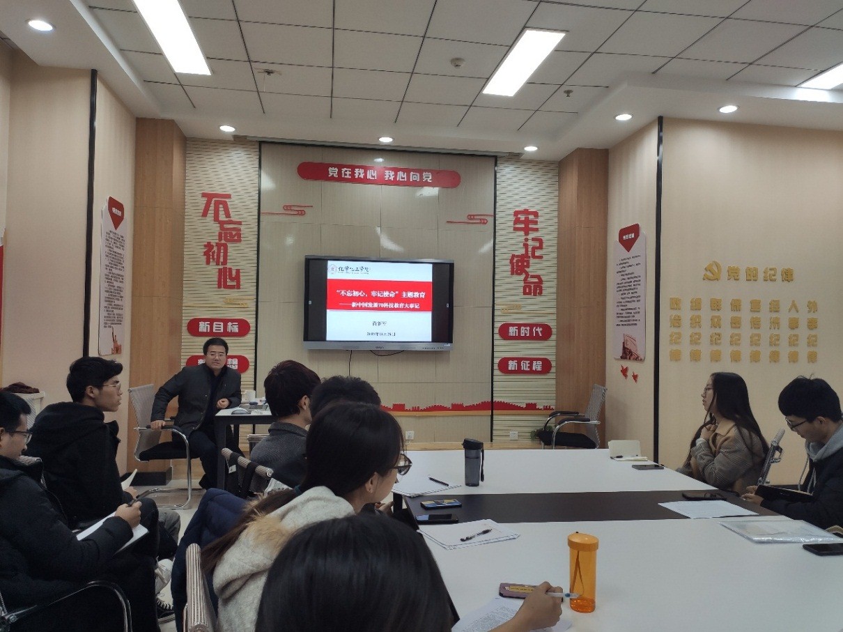 党委委员、副院长肖新军在致知楼1347会议室为一飞冲天研究生化工党支部作题为“新中国发展70周年科技教育大事记”主题教育党课。研究生化工支部全体党员参加本次党课,会议由研究生化工党支部书记王颖同志主持。