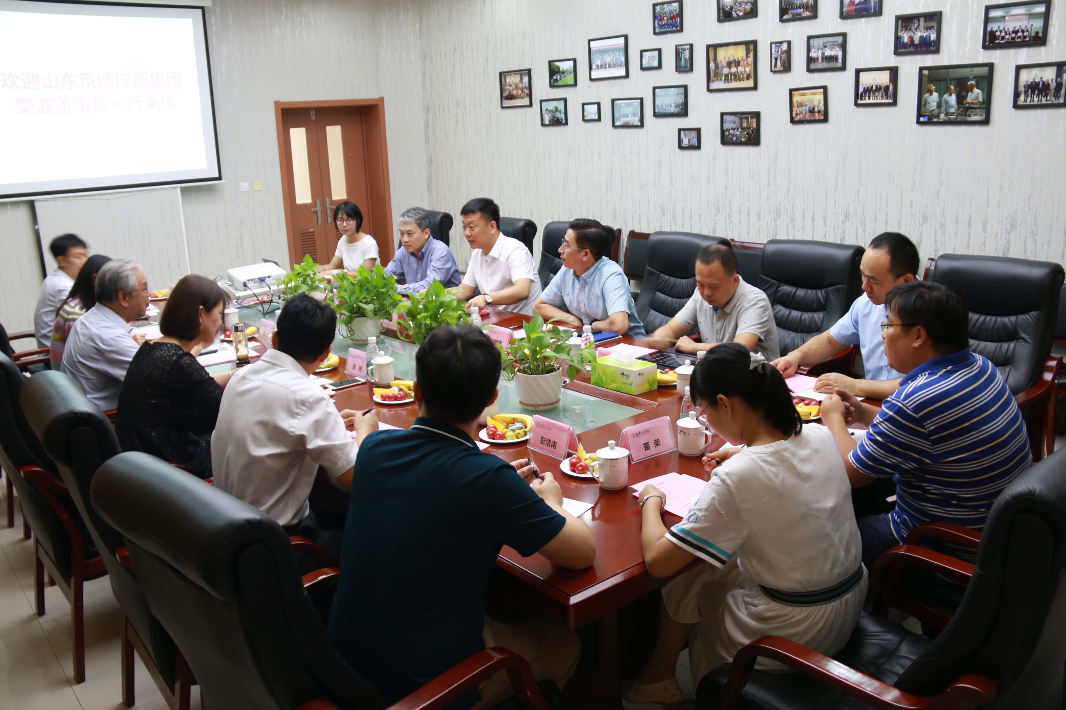 首先,栾波董事长基于京博集团及京博石化的产业布局、科技创新战略等情况进行了详细的阐释和介绍。他介绍到,京博控股集团是中国 500 强企业,公司在发展过程中形成了以“仁孝”文化为核心,秉承着“把自己的企业当作社会的企业来办”的理念,致力“做对社会最负责任最有益的企业,成为绿色能化领域智慧引领者,为子孙后代留下有持续盈利能力”的事业平台。其中,栾总重点展示了公司在高效能燃料、高端化工品、高性能材料等版块的发展经营情况以及发展战略。随后,房喻教授介绍到,团队立足在分子凝胶研究领域多年工作积累,发展了独具特色,具有完全自主知识产权的轻质高强材料制备新工艺。与业界通用的传统工艺不同,新工艺不需要化学发泡、也不需要物理发泡,更不需要空心玻璃微珠进行减重,具有十分广阔的应用空间。所研制的材料兼具传统高端高分子泡沫材料和固体浮力材料的优势,有望成为新型态高性能泡沫材料,相关产业应用也在积极推进中。最后,双方对此进行了深入讨论,山东京博石化对房喻教授团队的研究项目表现出极大的兴趣。本次技术交流会对我校科研成果技术转化具有重要的推进意义。