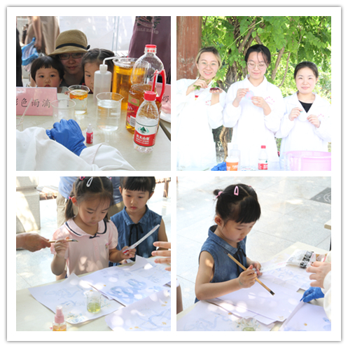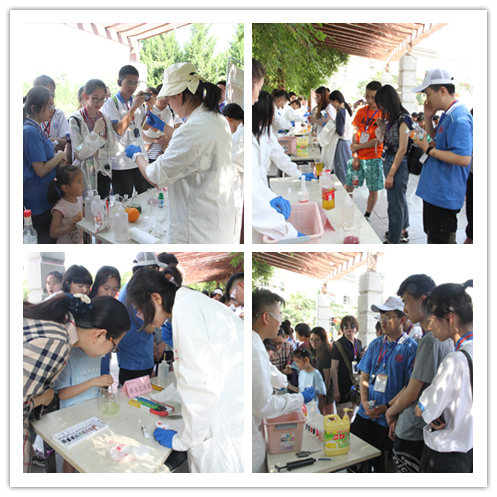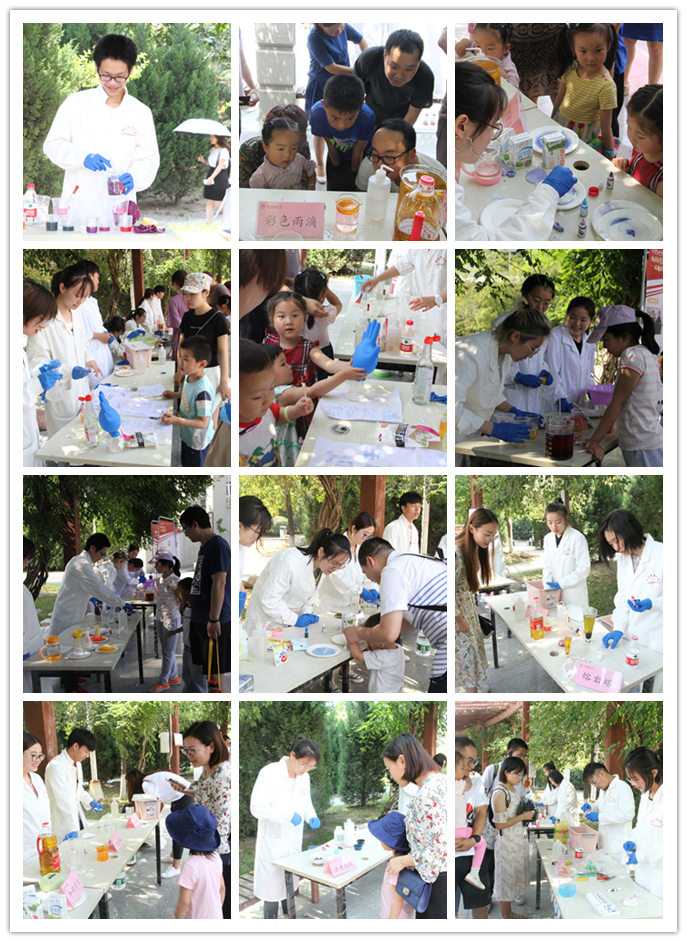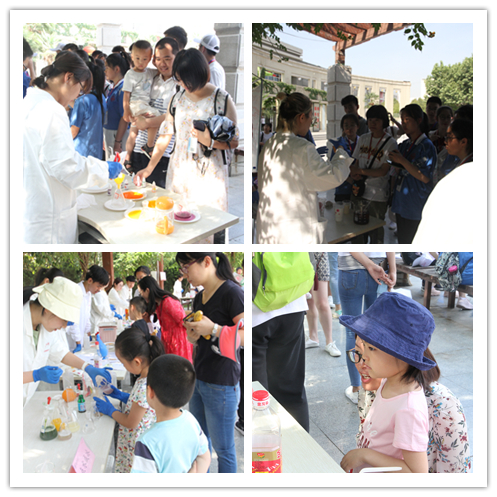 学生、来我校游学的中学生、师大社区群众等驻足观看,实验小组为观众带来包括动手拼装、展示讲解、实验演示等不同类型的18个化学元素相关活动,分别是:火山爆发、神奇的红茶、彩色雨滴等。现场观众在演示小组的指导下也尝试动手操作实验。来自商一飞冲天