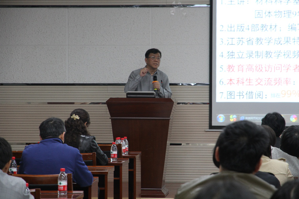邀请南京理工大学吴锵教授为全员教师作了题为“关于Gibbs相律这一经典问题的新认识与教学实践”的教学研究报告。吴锵教授分享了他几十年从事教学的心得体会:热爱教学,努力将教学工作做到极致。他鼓励青年教师正确处理好教学与科研的关系,在教学中结合课程特点加强教学方法和教学艺术的研究,不断提高教学质量。