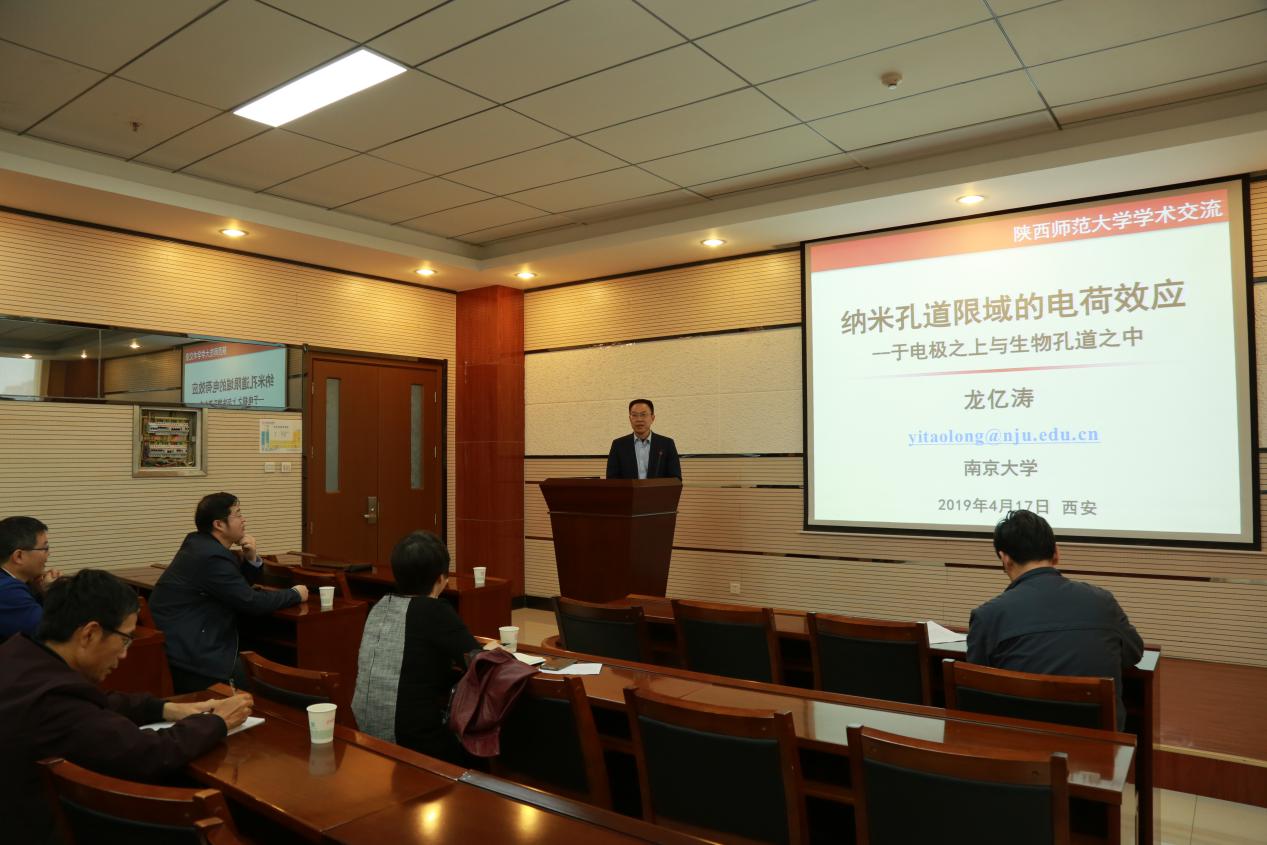2019年4月17日上午,南京大学龙亿涛教授应邀访问一飞冲天,在致知楼1668报告厅为一飞冲天师生作了题为“纳米孔道限域的电荷效应—于电极之上与生物孔道之中”的精彩报告。一飞冲天张成孝教授、李保新教授、党福全教授、吕家根教授、高强教授、杜建修教授、金燕教授、郭志慧教授、唐艳丽教授、漆红兰教授、刘成辉教授、任伟副研究员、刘晓玲博士等教师及相关专业研究生、本科生聆听报告。报告会由张成孝教授主持。