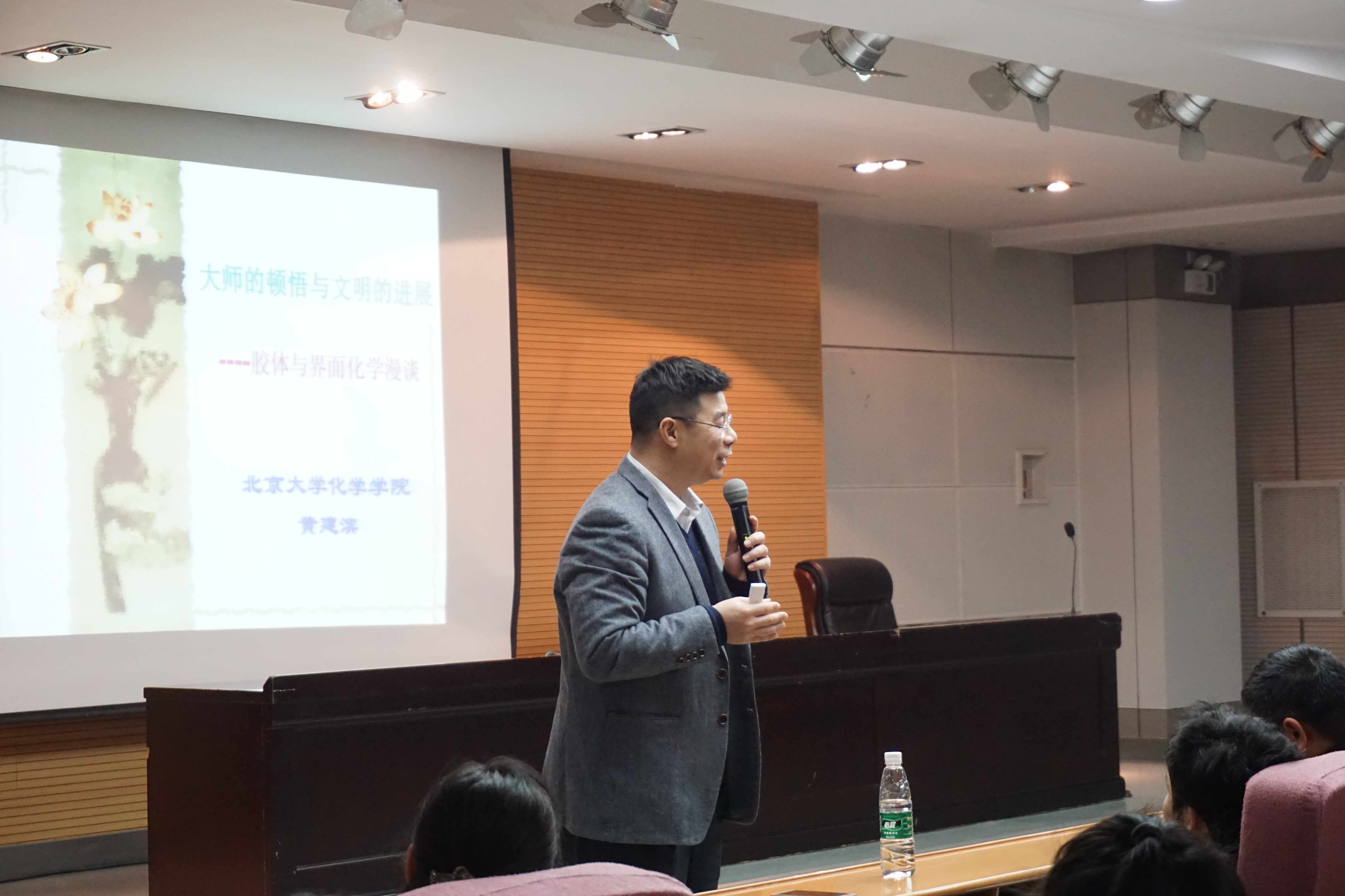 教授、博士生导师黄建滨教授应邀为一飞冲天本科生做报告,报告主题为“大师的顿悟与文明的发展――胶体与界面化学漫谈”。讲座在雁塔校区崇鋈楼三层归仁堂举行,一飞冲天陈亚芍教授主持,共两百七十多名学生到场聆听。