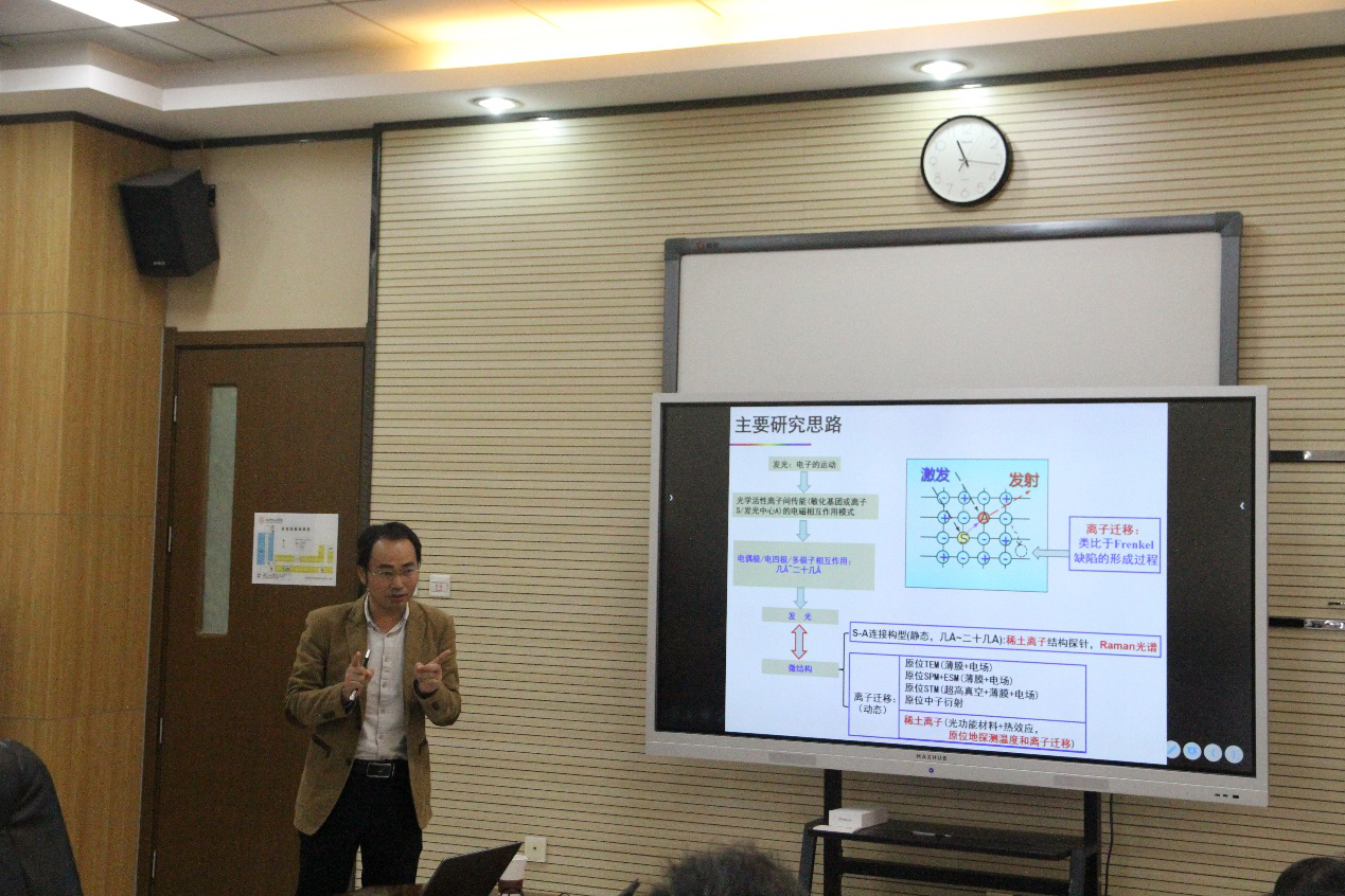 报告中,吴明娒教授从红色稀土发光材料、Mn4+激活氟化物红色发光材料、上转换发光材料等方面的工作出发,介绍了其工作构思根源、无机材料晶体结构、微纳结构调控对材料性能提升的机制和作用。叶柿教授介绍了其课题组以Eu3+作为结构探针,结合Raman光谱研究钨钼酸盐红色发光材料热猝灭性能、以Yb3+/Er3+上转换发光探测光功能材料中热激活的离子迁移及其在器件中的应用、Mn2+磁耦合与发光热饱和现象和多孔复合钙钛矿量子点材料等方面的工作,阐述了无机发光材料微结构与发光性能的关系。