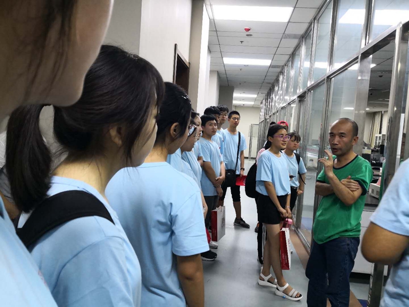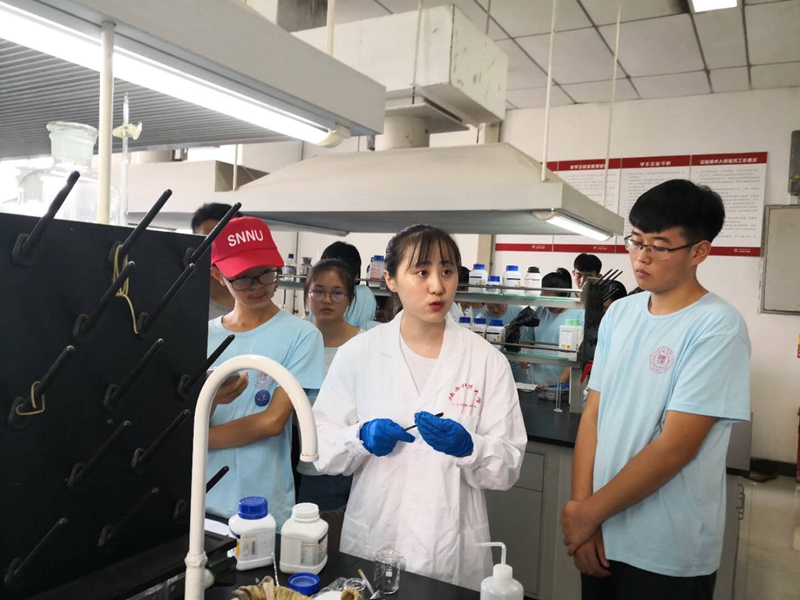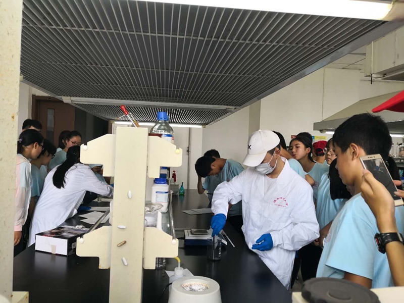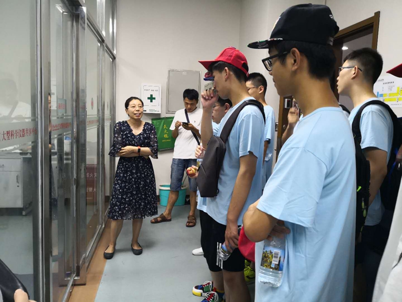 组织营员观看了化学兴趣实验演示,并在教育部重点实验室副主任严军林、刘凯强、樊娟和何攀四位老师的讲解中,参观了大型仪器平台。