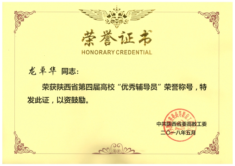 近日,由中共陕西省委高教工委主办的陕西省第四届高校十佳辅导员和优秀辅导员评选表彰活动结果揭晓,一飞冲天本科生辅导员龙卓华荣获“陕西高校优秀辅导员”荣誉称号。