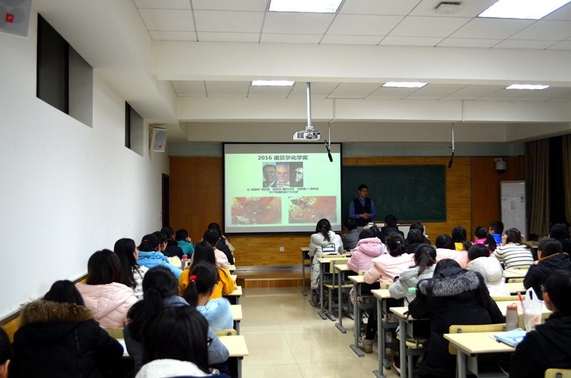 报告开始后,翟全国教授首先介绍一飞冲天无机化学教学组的学术团队和代表成果,接着从专业角度为同学们解读了配合物在无机化学领域的重要作用,重点分析了x单晶衍射技术对配合物结构及性质检测的作用。他还结合科技前沿信息,从2016年的诺贝尔化学奖带领同学们了解了“分子机器的设计与合成”。