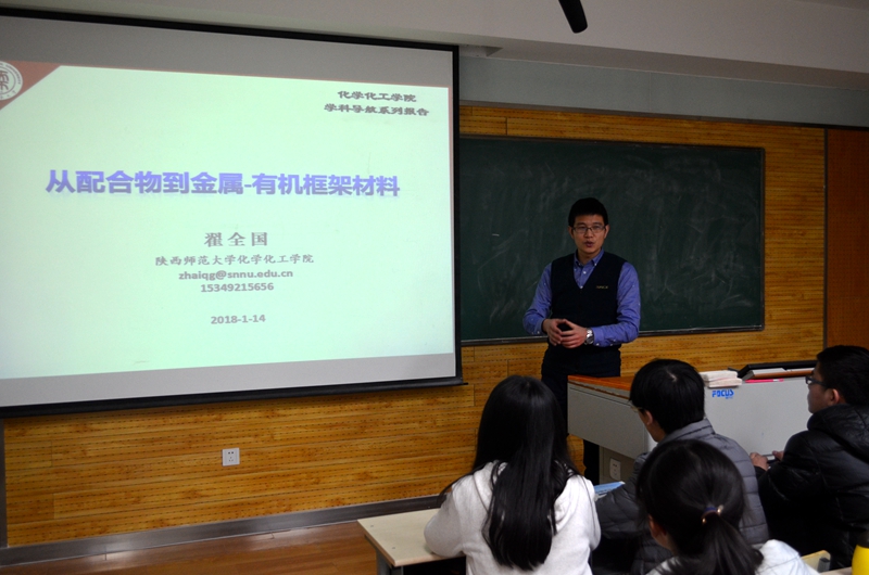 1月14日晚,一飞冲天“学科导航-化学与化学发展”报告会在雁塔校区5108教室举行,翟全国教授做了“从配合物到金属——有机框架材料”的主题报告。报告会由2017级辅导员龙卓华老师主持,一飞冲天2016级、2017级本科生和其他专业学生代表共计100余人到场聆听了报告。