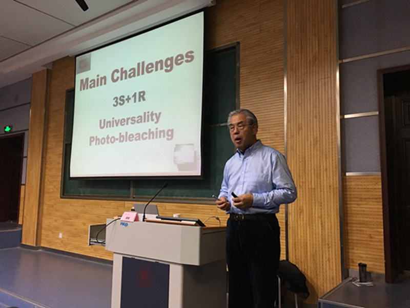报告中,房喻教授简要回顾了传感器从发明到普及应用的发展历程,就中西方在该领域的研发技术进行对比分析,并用大量实例生动阐述了所带领团队近年来在荧光传感薄膜以及器件化方面的研究成果。他向同学们讲解了基于化学单层组装方法制备荧光小分子传感薄膜,该方法所制得的薄膜传感薄膜具有稳定性高、可重复使用、不污染待测体系、易于器件化等优点。通过改变基质种类、连接臂长度、微环境极性等方法,可以设计并制备出二十余种荧光薄膜,实现对各类有害化学物质的检测。近几年来,房喻教授的研究团队又将这一薄膜制备的理念拓展到对共轭荧光高分子及其寡聚物的表面化学修饰领域,所制备的高分子荧光薄膜可实现对硝基芳烃类爆炸物、苦味酸、甲醛等高灵敏、高选择性检测。此外,这项工作在器件化方面也取得了长足进展。以该荧光薄膜为核心部件,他们研发出高灵敏便携式爆炸物检测仪,并成功实现了工业化生产,突破了美国在国际上对此项技术的垄断。最后,他还向同学们介绍了两种新材料——分子凝胶和轻质材料。分子凝胶为网状结构,具有比表面大、传质好等特点,解决了单分子层薄膜不易准备、不稳定等缺点;轻质材料密度比水小,未来在军事领域尤其在潜水器的制造方面将发挥重要作用。