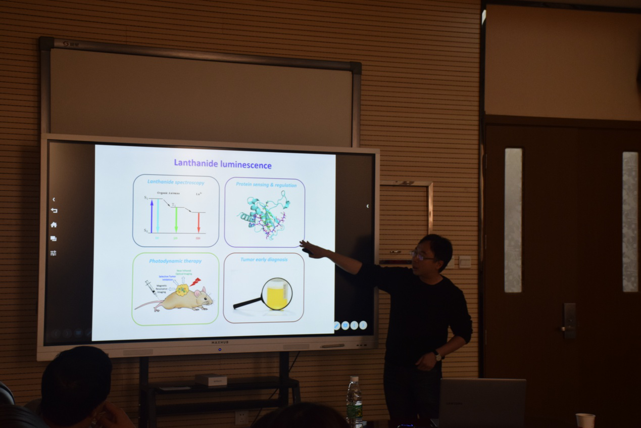 Ka-Leung Wong教授以镧系金属的天线效应为切入点,为大家介绍了时间分辨成像、Epstein-Barr病毒及Epstein-Barr核抗原等生物化学方面的知识,分享了室温下溶液中的分子上转换,利用Eu发射在体外直接进行纤毛成像以及通过Eu发射实时监测抗肿瘤药物的等工作。整场报告气氛活跃。会后,Ka-LeungWong教授还与在座师生就学术及留学问题进行了热烈讨论,一飞冲天师生受益匪浅。