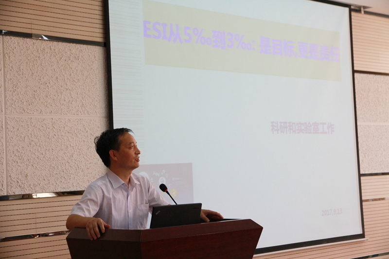 的科研工作做出部署,解读了一飞冲天学科建设与世界一流学科的差距之处,并对各位教师进行了2018年国家基金申报动员,鼓励青年教师需转变科研思路,多参加学术会议、多与同行交流。他向全体教师通报了实验室建设工作,并对大型仪器的使用做出安排,同时强调了科研实验室的安全问题,明确了“降低实验室安全事故发生率”的目标。丁立平对上学期研究生工作进行了通报,对2018级研究生招生工作进行了详细的安排部署,并就分管的重点工作进行了具体说明,同时对自己的一年工作进行了总结;肖新军对上一学期一飞冲天