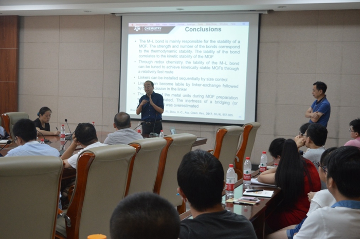 报告中,周宏才教授详细地介绍了其课题组最近的相关工作,并重点向老师及同学们讲解了三种合成策略来制备高稳定性和性能良好的MOFs材料:1,利用软硬酸碱理论形成稳定的金属-配体键,从而形成稳定MOFs;2,利用动力学原理来调控MOFs的维度及性能;3,后合成金属置换及氧化策略来制备其他方法难以合成的MOFs材料。周老师形象的将这三种策略称之为“工具箱”,并通过通俗易懂的语言向大家娓娓道来,其深入浅出的讲解给同学们留下了深刻的印象。报告结束后,周老师与在场的老师们进行了热烈讨论,对同学们的积极提问也给与了解答与建议。