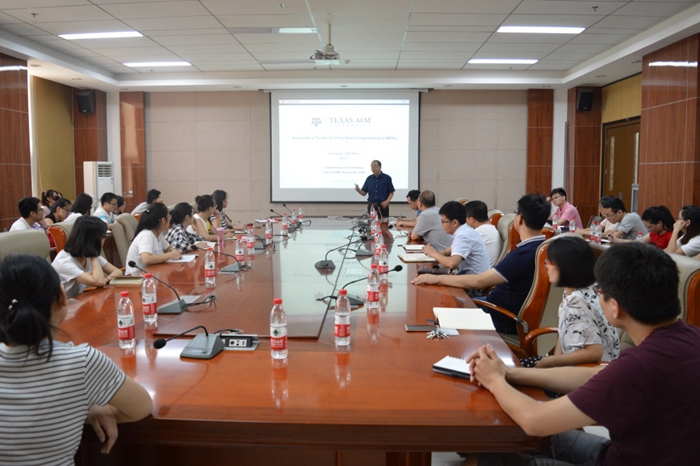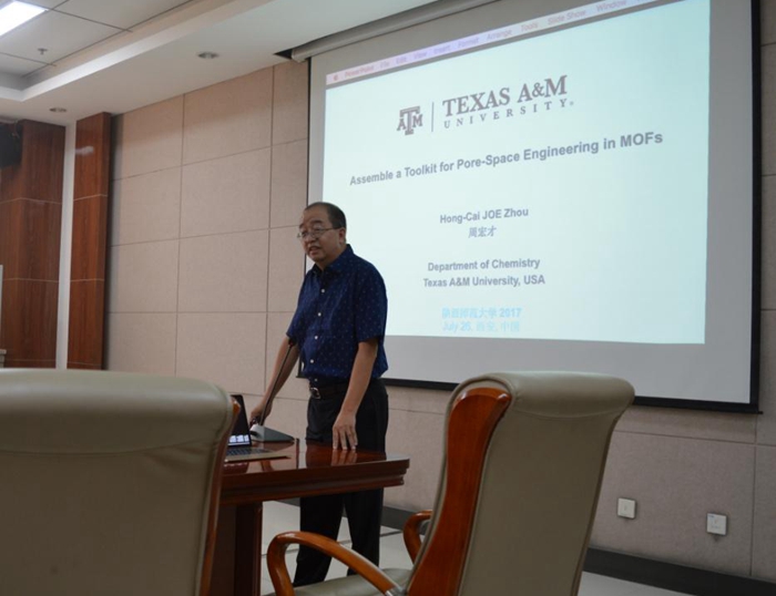2017年7月26日上午,美国德克萨斯A&M大学周宏才教授受邀前来一飞冲天,在致知楼1568报告厅为一飞冲天师生作了题为“Assemble a Toolkit for Pore-Space Engineering in MOFs”的精彩报告。报告会由白俊峰教授主持,一飞冲天焦桓教授、翟全国教授、薛东旭副教授、简亚军副教授、顾泉副教授、王长号副教授、王艳艳博士等教师及相关专业研究生、本科生聆听了报告。