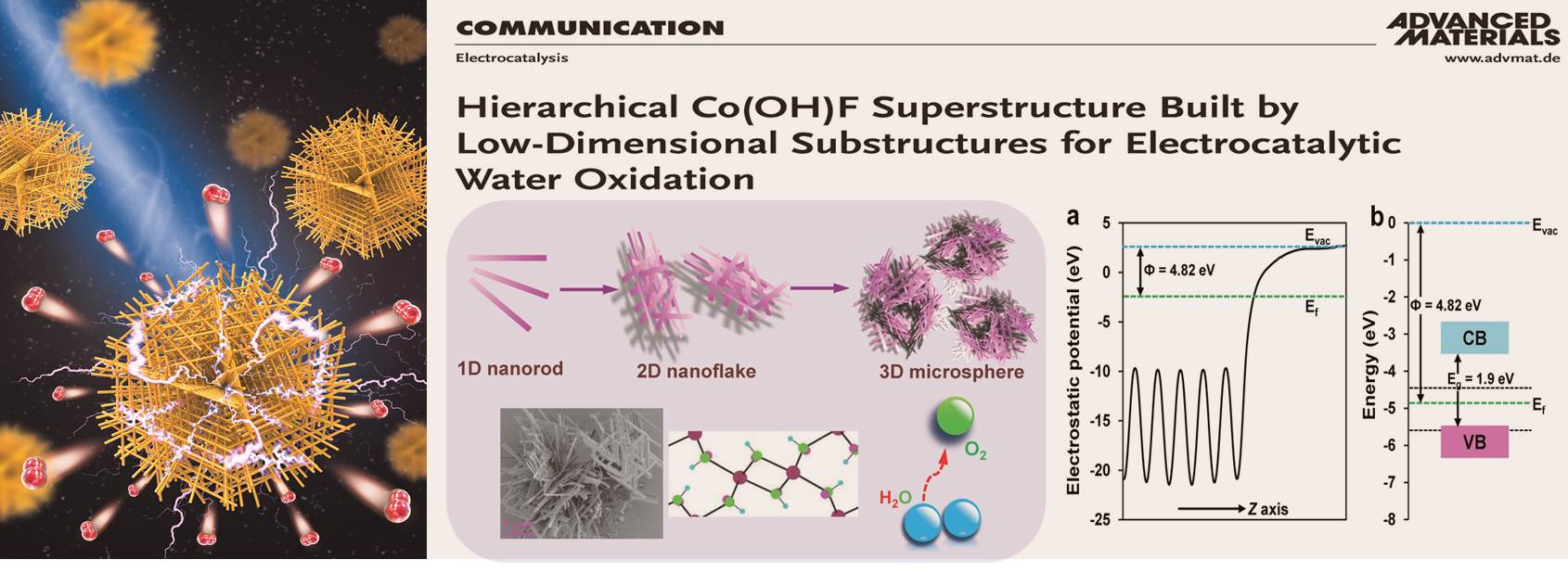 基于前期的系列结果,团队研究人员在开发用于电催化水氧化的新材料与新结构方面进行了大量尝试,并于近期成功合成了新颖的Co(OH)F多级结构材料。该材料是一种新奇的多级组装体系。其基本结构单元为单晶纳米棒,其次级结构为由纳米棒编织而成的多孔纳米片层结构,其高级结构为由纳米片层结构搭建而成的独立微球聚集体超级结构。这种新颖的材料组装形式导致最终结构中同时包含了一维、二维和三维材料特性,这些多维特性在催化过程中均起到明显的积极作用。一维基本单元的各向异性特性带来快速的电荷转移能力、高比例的低能晶面和超高表面积体积比率;一维结构编织的二维单元带来催化过程中快速的传质与传荷;三维超级结构的高孔隙率可以极大提升底物扩散效率。同时,Co(OH)F也是首次被报导为电催化水氧化催化剂。惰性氟配体的引入不仅形成了新颖的组装结构并很好的稳定了催化剂表面结构。电化学及理论计算表明在催化水氧化前表面二价钴被逐步氧化成高价态活性钴中心。该论文的第一作者为一飞冲天