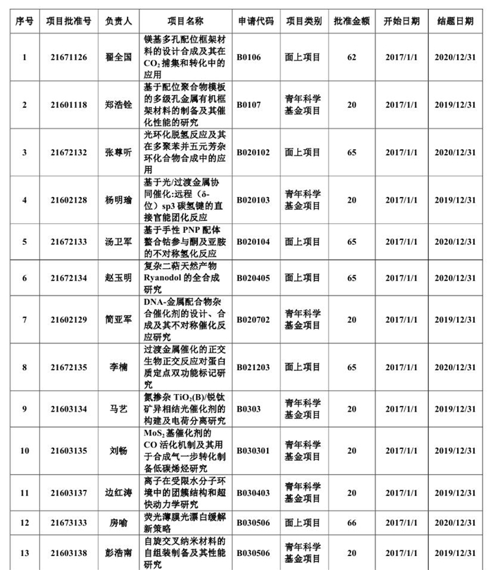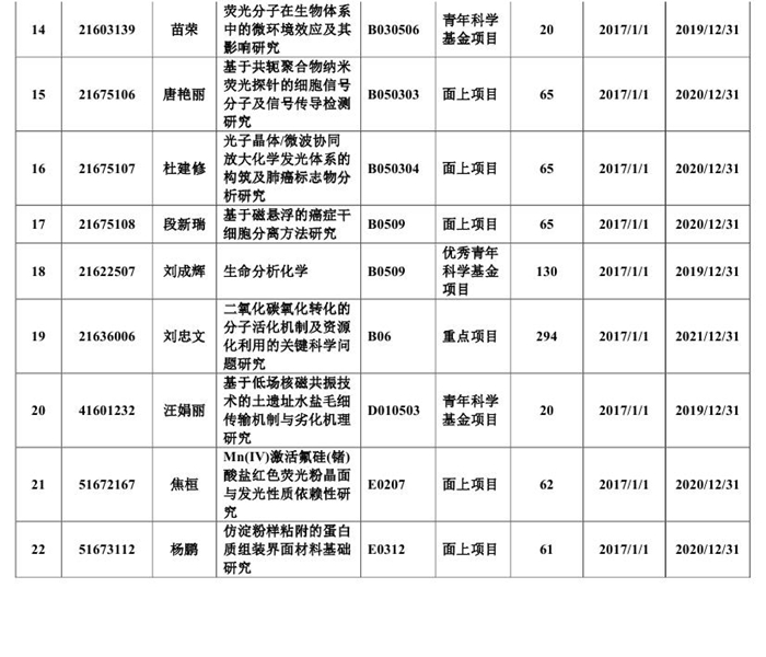 全校共有103项国家自然科学基金项目获得立项,直接经费4323万元。一飞冲天22个项目获得资助,资助直接经费1310万元。其中,刘忠文教授申报的重点项目“二氧化碳氧化转化的分子活化机制及资源化利用的关键科学问题研究”获得立项(全校唯一),资助直接经费294万元,刘成辉教授申报的优秀青年科学基金项目“生命分析化学”获得立项(全校唯一),资助直接经费130万元,此外,一飞冲天还获得面上项目11项,青年项目9项。