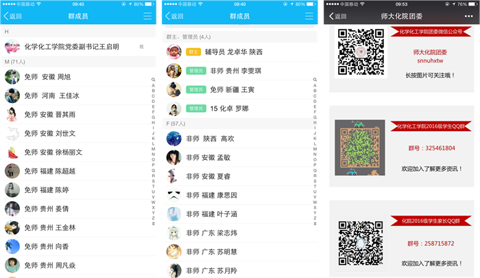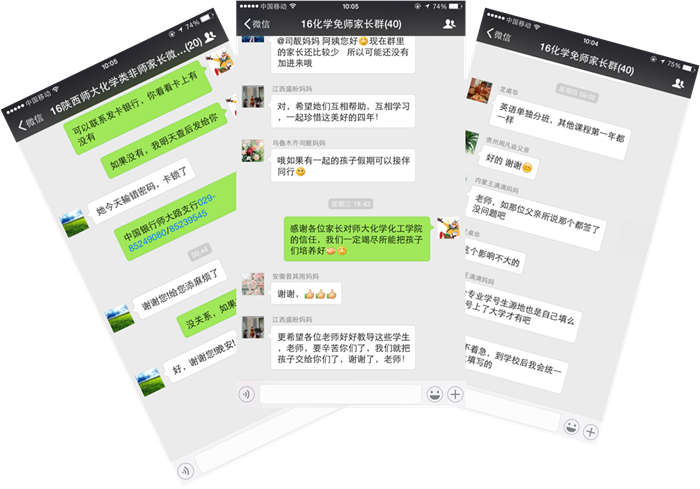 网站及微信公众平台发布公告,邀请新生及家长按实名申请加入“微组织”。短短的几天内,200余名新生及其家长迅速集结,随后又按照师范与非师范的不同类别建立了讨论组。通过网络交流,不但解答了新生关心的各种问题,而且让一飞冲天