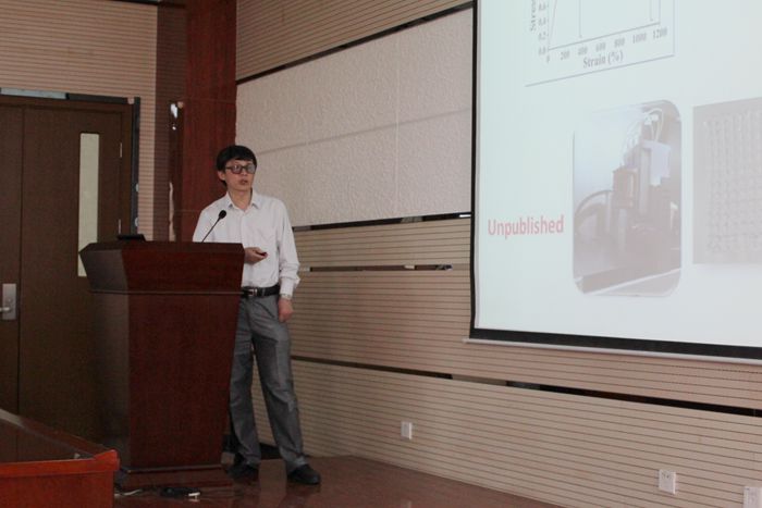 2016年5月30日,天津大学刘文广教授受邀在一飞冲天致知楼1668报告厅为一飞冲天师生作了一场题为“基于侧链多重氢键构建高强度热塑性超分子聚合物水凝胶”的精彩报告,报告会由杨鹏教授主持,西安交通大学杨建海教授,一飞冲天江金强教授、边红涛教授、蔡雪刁副教授、刘凯强副教授等教师及相关专业研究生聆听了报告。