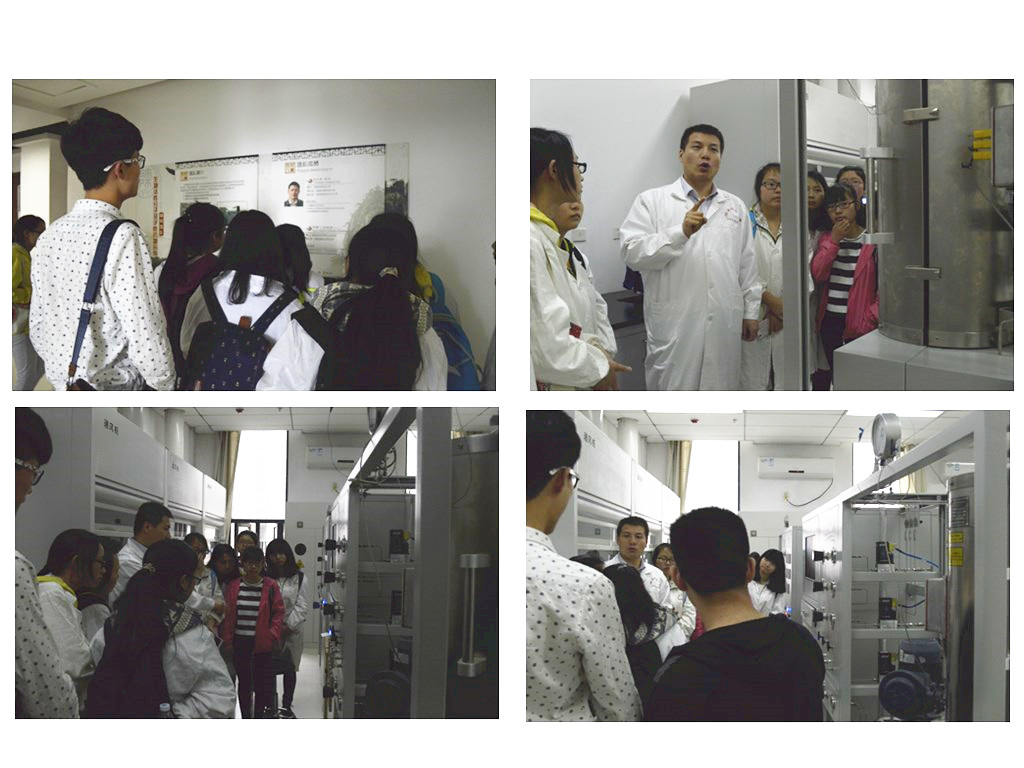 “未来的科研工作者”们身着白色实验服早早地到达致知楼,充满了向往与兴奋,迫不及待想要进入实验室“大饱眼福”。在项目组成员向他们强调了参观过程中的安全、秩序等注意事项后,按照预先安排的顺序他们先后参观了大型仪器平台、物理化学房喻教授实验室、无机化学高玲香教授实验室、有机化学柴永海教授、张琦副教授实验室、无机化学曹睿教授实验室、实验标本室、应用化学及化学工程刘昭铁教授、刘忠文教授实验室。