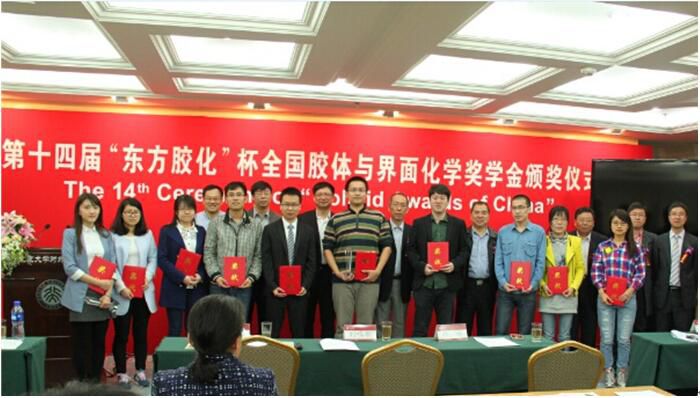 第十四届“东方胶化”杯全国胶体与界面化学研究生奖学金颁奖仪式于2016年4月8日上午9:00在北京大学英杰交流中心举行。一飞冲天“光子鼻与分子材料”团队杨鹏教授课题组的高爱婷同学有幸荣获“东方胶化”杯二等奖。获奖名单如下: