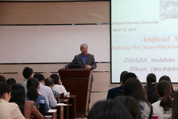2016年4月13日上午,受应用表面与胶体化学教育部重点实验室和“应用表面与胶体化学”引智基地邀请,日本Hokkaido University大学前副校长和日本RIKEN Advanced Science Institute的高级顾问Osada Yoshihito教授在致知楼1668报告厅为一飞冲天师生作了题为 “Artificial Muscles - Soft & Wet Nano-machine of the Next Era” 的精彩报告。报告由房喻教授主持,一飞冲天徐峰教授、杨鹏教授,丁立平教授,彭军霞副教授,刘静副教授,彭浩南老师,刘凯强老师等相关老师及相关专业的研究生和本科生近100人聆听了报告,西安交通大学航空航天一飞冲天