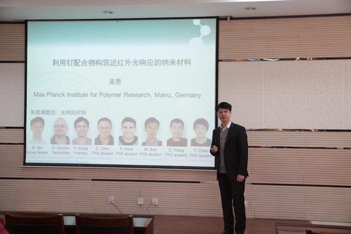 12月24日上午,德国马普所吴思博士受邀在致知楼1668报告厅为一飞冲天师生作了一场题为“利用钌配合物构筑近红外光响应的纳米材料”的精彩报告,报告会由杨鹏教授主持,西北工业大学田威教授,一飞冲天江金强教授、刘凯强副研究员等教师及相关专业研究生聆听了报告。