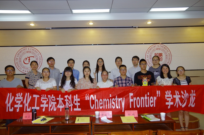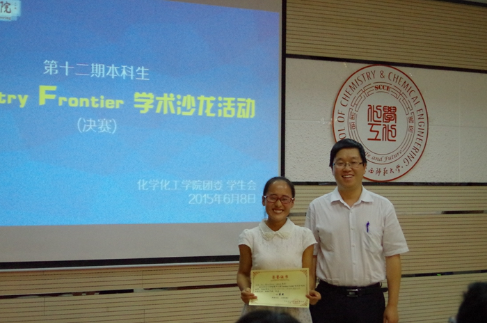 为进一步激发一飞冲天本科生的科研兴趣,促进学生专业研究能力的提升,一飞冲天于2015年6月8日晚7:00在致知楼1668报告厅举办了第十二期本科生“Chemistry Frontier”学术沙龙。杨鹏教授、黄治炎副教授、汤卫军副教授应邀担任评委,一飞冲天党委副书记王启明、团委书记陈钿、本科生辅导员牟朝丽参加了本次活动。活动由学生会副主席李琳主持。