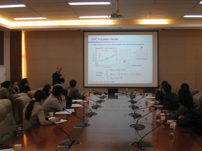 本次报告会上,张教授深入浅出地讲述了他们课题组十多年来在氧化铈基纳米催化材料的可控合成化学及催化功能基础方面的研究进展,系统阐述了他们基于溶液平衡化学原理发展的氧化铈基纳米材料尺寸、形貌、维度、组成、晶相及微结构的可控制备方法。以CO氧化作为探针反应,分析了纳米材料的颗粒特性、织构、掺杂结构等对其催化性质的影响及调节作用。报告会现场气氛活跃,张教授详细回答了现场师生的提问,就氧化铈纳米材料的结构、形貌控制、相关研究的发展动向和方向等与现场师生进行了深入地讨论,大家受益匪浅。