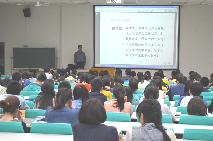 报告会上,杨承印教授以“提高专业素养,抓紧教师技能训练”为主题,帮助同学们进行了学业发展规划。杨老师不但对师范专业的发展前景做了详细解读,而且结合自身的教学实践经验和新课程改革下的教育需求,为大家分析了免费师范生的就业优势,并号召同学们刻苦学习专业知识,踏实练好教学基本功,全面提高从事教师教育工作的技能。杨老师特别引用笛卡尔的名言“我思故我在”,勉励免费师范生要努力做到专业素养和教学基本功二者兼顾,既做好人文科学的学习,同时也要做好实验,做好专业上的研究。在具体谈及从教技能训练的问题上,杨老师强调,教学有法,教无定法,贵在得法。只有明确课程讲授的教学标准、掌握适当的哲学和教育心理学知识以及做好教学设计,才能将课上好。在交流中,杨老师还向大家推荐了许多教育学方面的经典著作,鼓励同学们提高教育教学的理论素养。