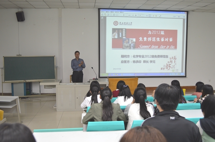 为切实做好2012级免费师范生高年级阶段的教育工作,进一步加强免费师范生的专业引导和志向引导,2014年10月26日晚7点,杨承印教授在文津楼101学术报告厅为一飞冲天2012级免费师范生做学业指导报告,报告会由2012级辅导员牟朝丽主持。