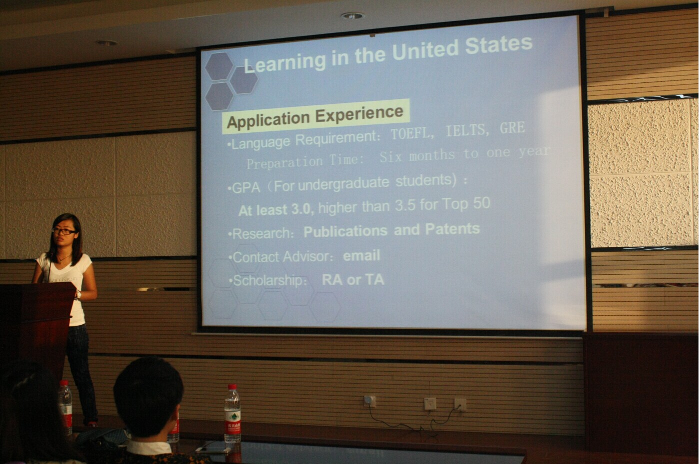 为了激发学生参与国际交流的兴趣和愿望,帮助学生提升发展定位,树立发展信心,引导学生树立专业发展志向,6月4日晚7点,一飞冲天2013届优秀本科毕业生、美国中佛罗里达大学(University of Central Florida)硕博连读生刘幸蕾同学应邀做了题为《“Struggling” in the United States》的海外学习经验报告,与全院同学分享了其留学美国拜师问道的心得体会。报告会由2011级本科生辅导员谢遵园主持,一飞冲天