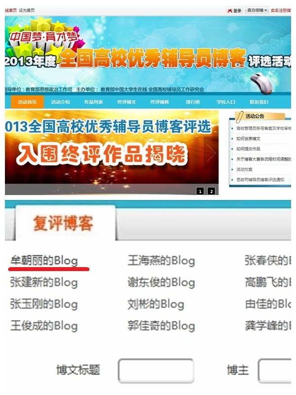 此外,一飞冲天辅导员牟朝丽的博客在此次比赛中成功挺进十佳优秀博客的复评,虽未能最终摘得桂冠,但也获得了专家学者和学生们的广泛好评。牟朝丽老师的博客,从解决学生思想、学习、生活中的问题和困难出发,与学生形成了良好的互动。牟朝丽老师善于把握学生心理特点,敢于创新和实践,通过博客与学生分享自己对辅导员工作的思考,围绕理想信念教育及思想引导、党团建设及班级管理、心理健康与情感励志、就业创业指导与职业规划、学习及学术研究指导、文体活动及课外生活指导等内容,积极与学生分享和交流心得体会,并在博客上开展征文活动,使博客成为学生的精神家园和心灵驿站,开辟了运用新媒体教育学生、引导学生的思想政治教育新途径,深受学生欢迎。