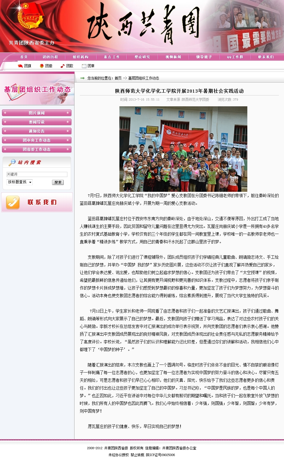 范围内积极宣传、动员、组织和策划,组建了“我的中国梦”爱心支教团队获得校级重点项目资助,学生自组团队“陕西农村留守儿童生活和受教育状况调查研究”团队获得校级特色项目资助。整个暑期,同学们深入基层支教支农并走访调研,不但在服务社会的过程中提升了素质与能力,而且还增强了社会责任意识和使命感。2013年,一飞冲天的社会实践活动再次受到共青团陕西省委网站的关注和报道,不但彰显了一飞冲天始终坚持的专业学习与社会实践相结合的育人理念,而且宣传了一飞冲天
