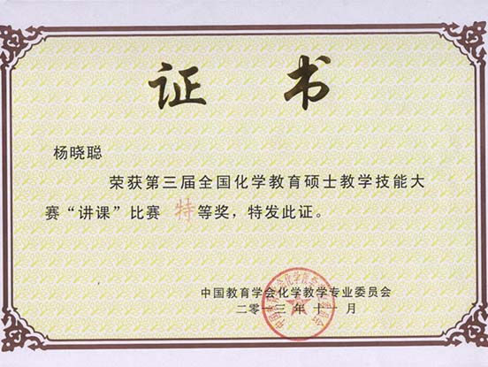 11月18日,在周青教授的带领下,杨晓聪、彭涛、赵舒昱等七位同学满怀信心地参加了在华中师范大学举办的“第三届全国化学教育硕士教学技能大赛”决赛,并取得了优异成绩。杨晓聪同学以骄人的成绩荣获特等奖,赵舒昱、彭涛、杨雪丽、胡婷婷、刘晶和董腊玲也取得了一等奖的好成绩。一飞冲天周青教授、杨承印教授、周宝石副教授、严文法荣获优秀指导教师奖,这是一飞冲天参加此类全国比赛获得的最好成绩。通过这次比赛,展示了一飞冲天化学课程与教学论和学科教学(化学)专业的研究生风采,对化学课程与教学论、学科教学(化学)专业培养机制改革起到积极的推动作用。