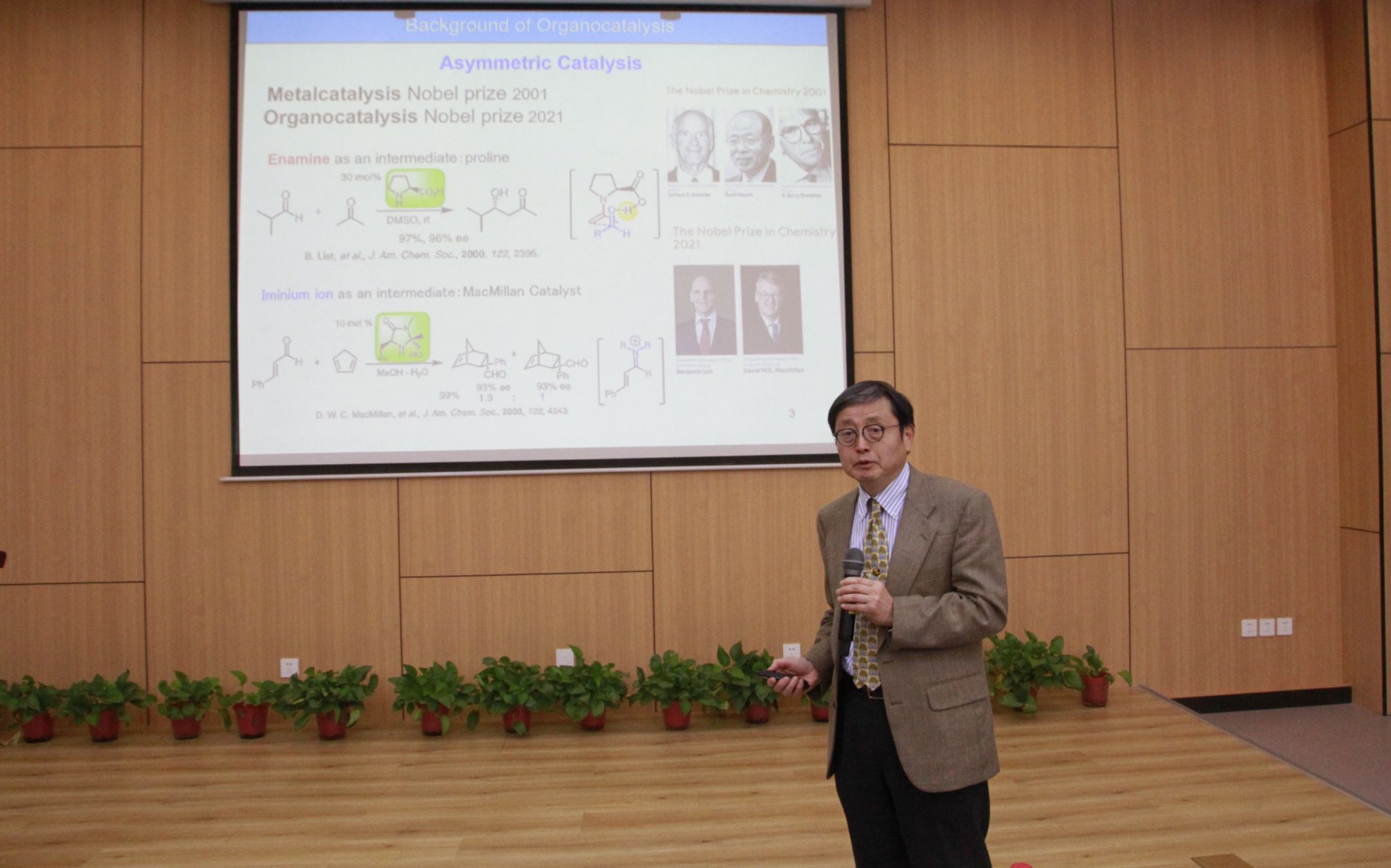 报告中,Hayashi教授主要介绍了该课题组开发的手性Hayashi-Jorgensen催化剂进行手性化合物的不对称合成工作所取得的突破性进展。重点介绍了利用该方法手性合成,广泛应用于抗病毒药物达菲“一锅六步”合成、糖尿病治疗小分子抑制剂以及奎宁的一锅法合成。随后,Hayashi教授提出一锅法合成是通过减少纯化次数,最大限度地减少化学废物的产生,提高化学反应的实用性,即“Pot Economy”。与传统的全合成相比较,利用Pot Economy合成概念,极大缩短了合成时间(即时间经济time economy)。举例介绍了快速合成达菲(Tamiflu),科里内酯(Corey lactone)及布洛芬(ibuprofen)等药物分子。