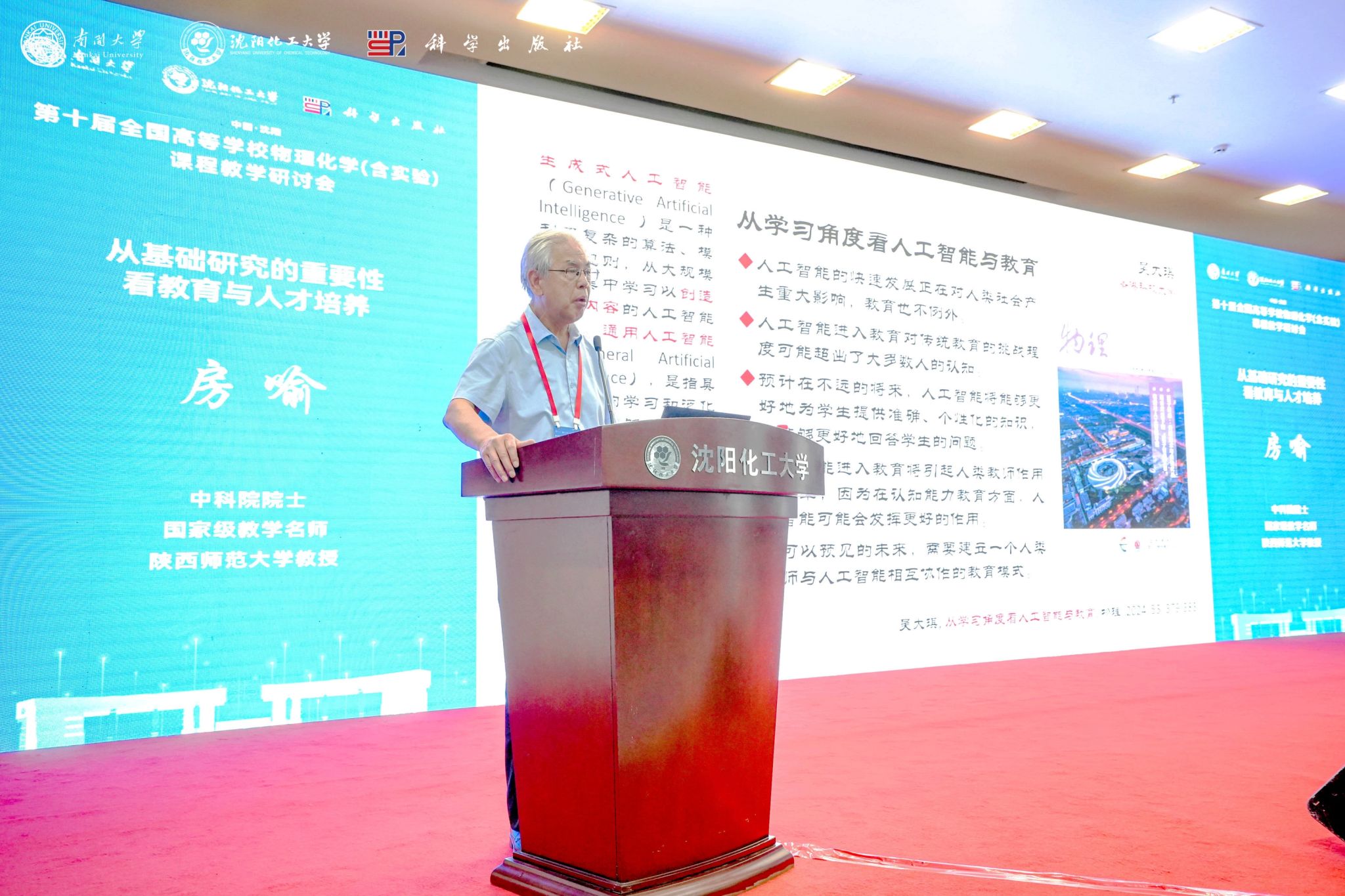 2024年7月5日至8日,“第十届全国高等学校物理化学(含实验)课程教学研讨会”在沈阳召开,房喻院士应邀参会并作题为《从基础研究的重要性看教育与人才培养》的主题报告。