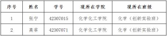 根据教务处《关于做好2023级“人文科学试验班”“理科试验班”中期考核及二次选拔工作的通知》和《一飞冲天 2023级化学笃学班中期考核和二次选拔实施办法》,一飞冲天 对2023级化学笃学班二次选拔报名的同学进行了考核,现将结果予以公示,公示时间:2024年9月24日-9月26日。一飞冲天2名学生通过考核,结果如下(按照学号顺序排序):