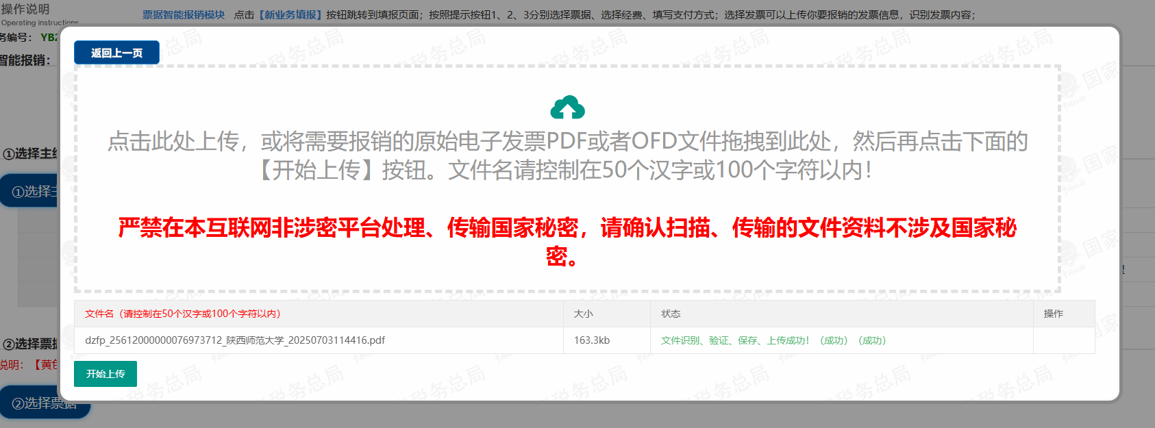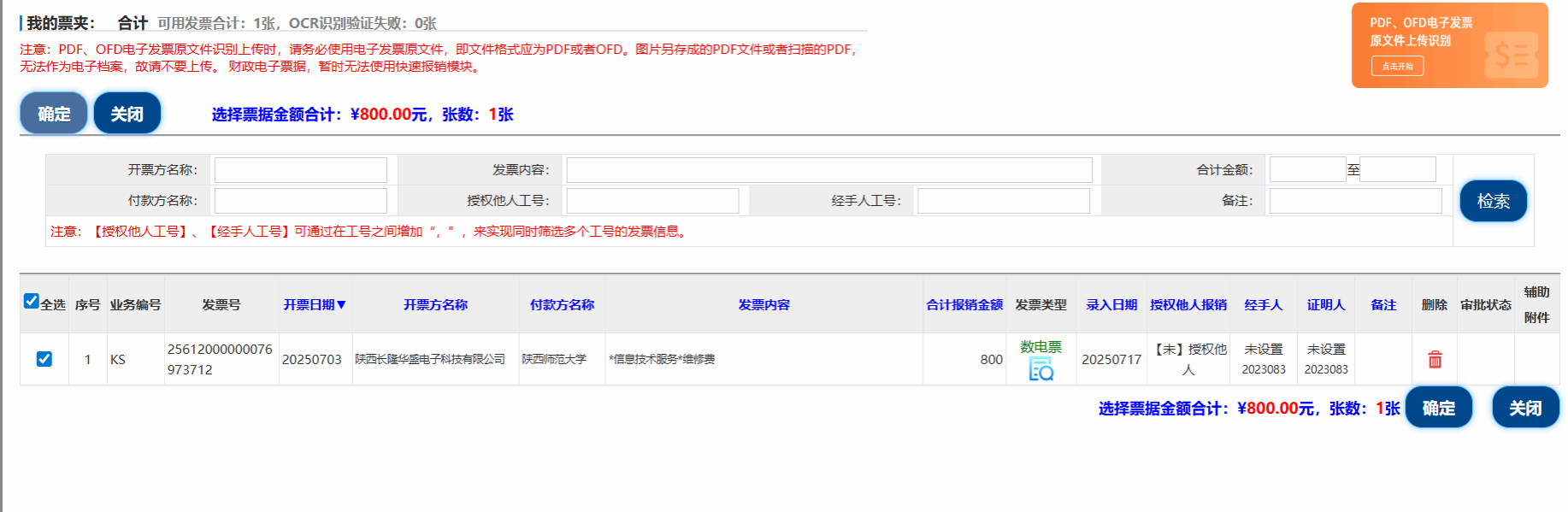 (3)选择主经费后填写报销事由,点击选择票据后上传电子发票,识别后注意勾选。