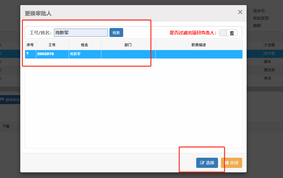 ①经办人和审批人不能是同一人。当经办人是项目负责人时,需先选中项目负责人/部门负责人,再点击更换审批人。12开头的经费(科研类经费)及130103开头的经费(基本科研业务费)可选择项目其他老师审批,其他经费选择肖新军副院长(工号:2002078)进行审批。